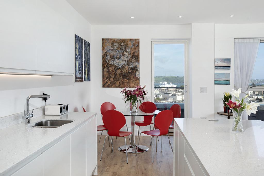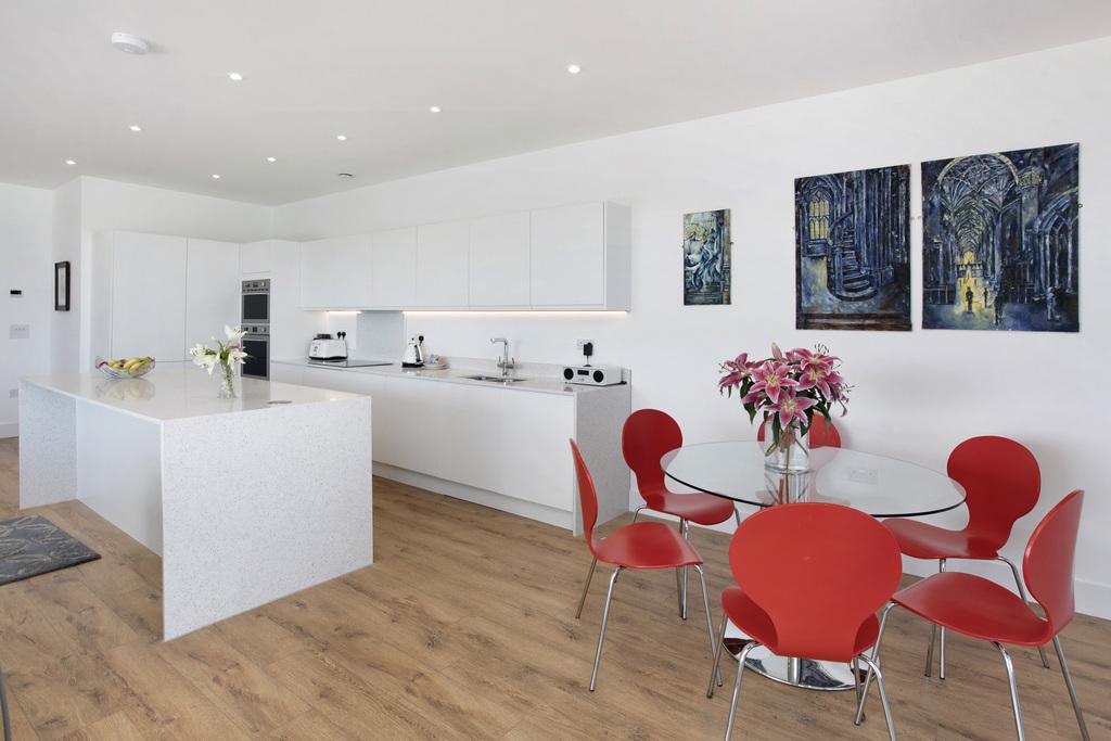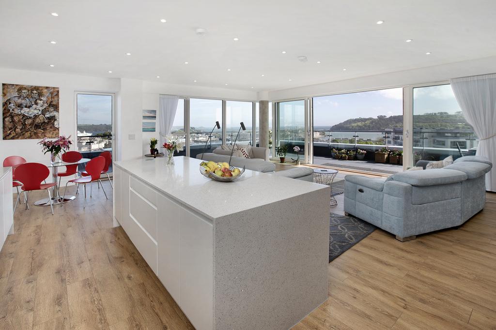 Inside, the apartment is finished to a high standard, with a calm, contemporary tone and well considered practicalities. Secure entry, underfloor heating and excellent storage support day-today life, while the wrap-around terrace extends the living space outdoors and follows the line of the view, offering different places to sit with the changing light. The entrance hall is welcoming, with a substantial bespoke cloaks cupboard and a separate utility/laundry room that keeps appliances and household tasks neatly out of sight.