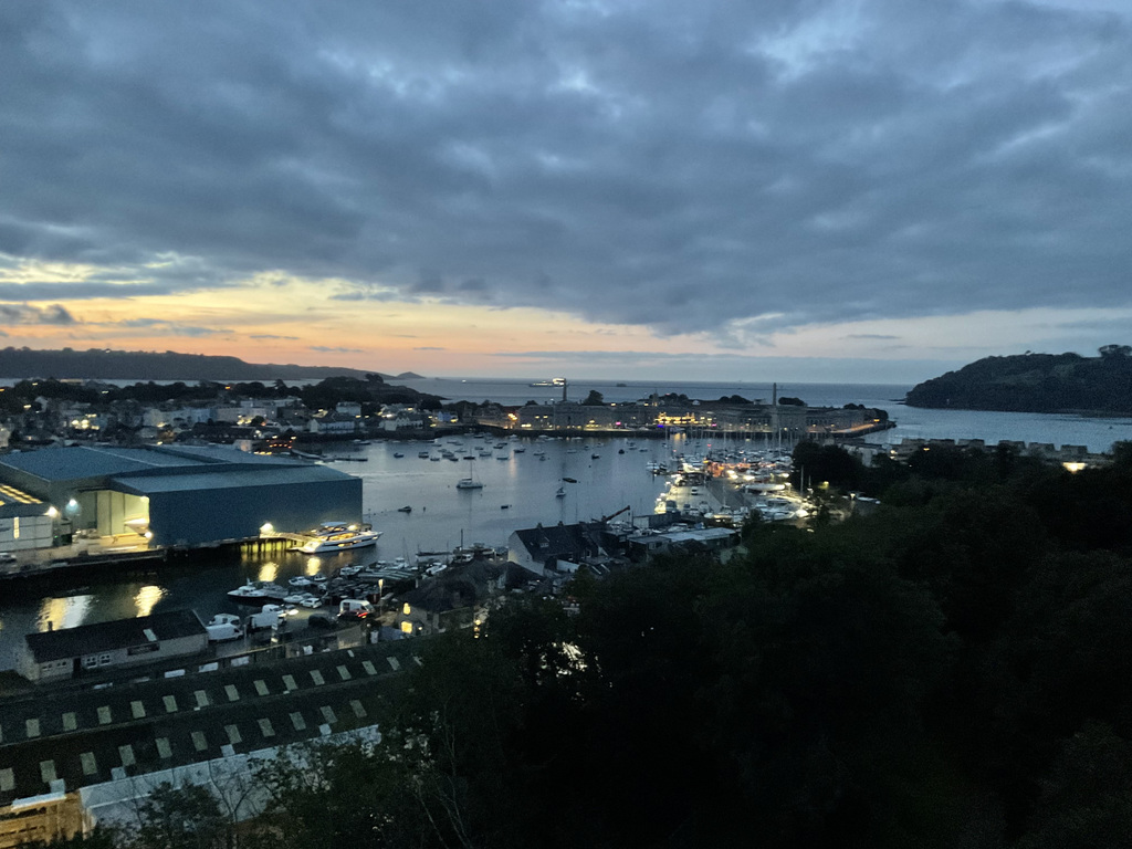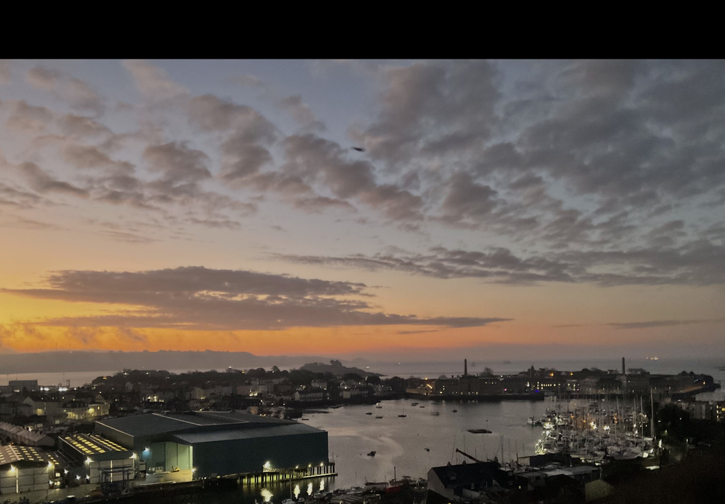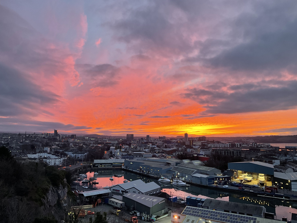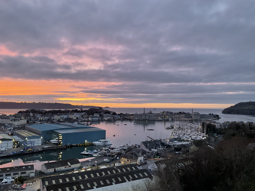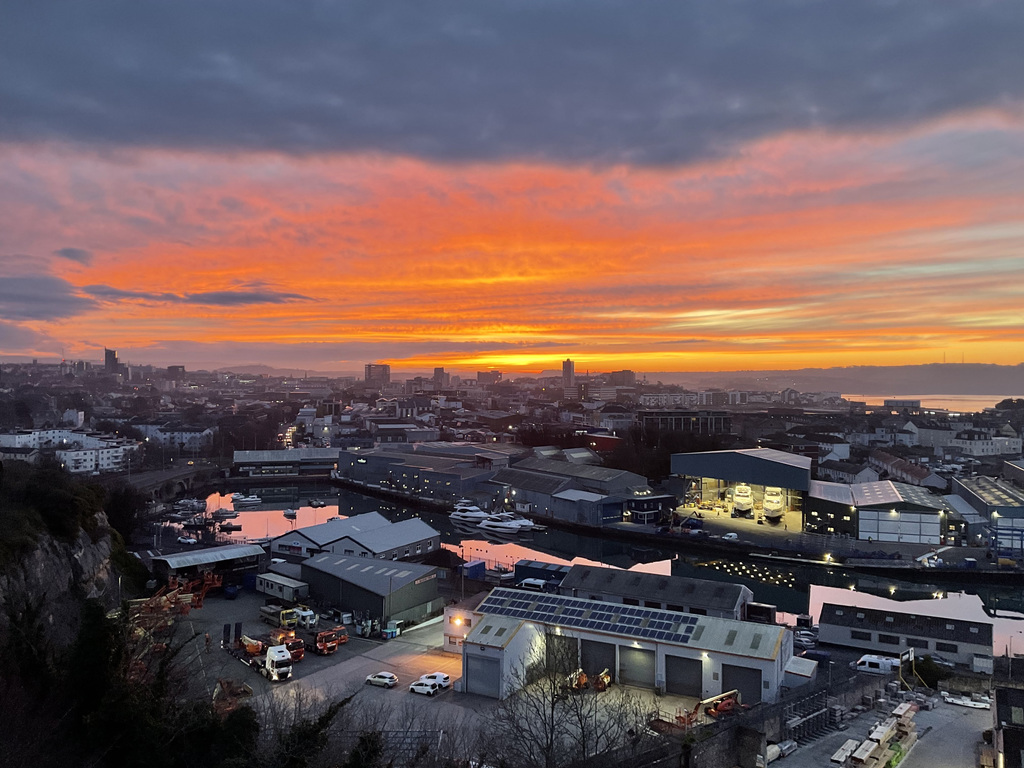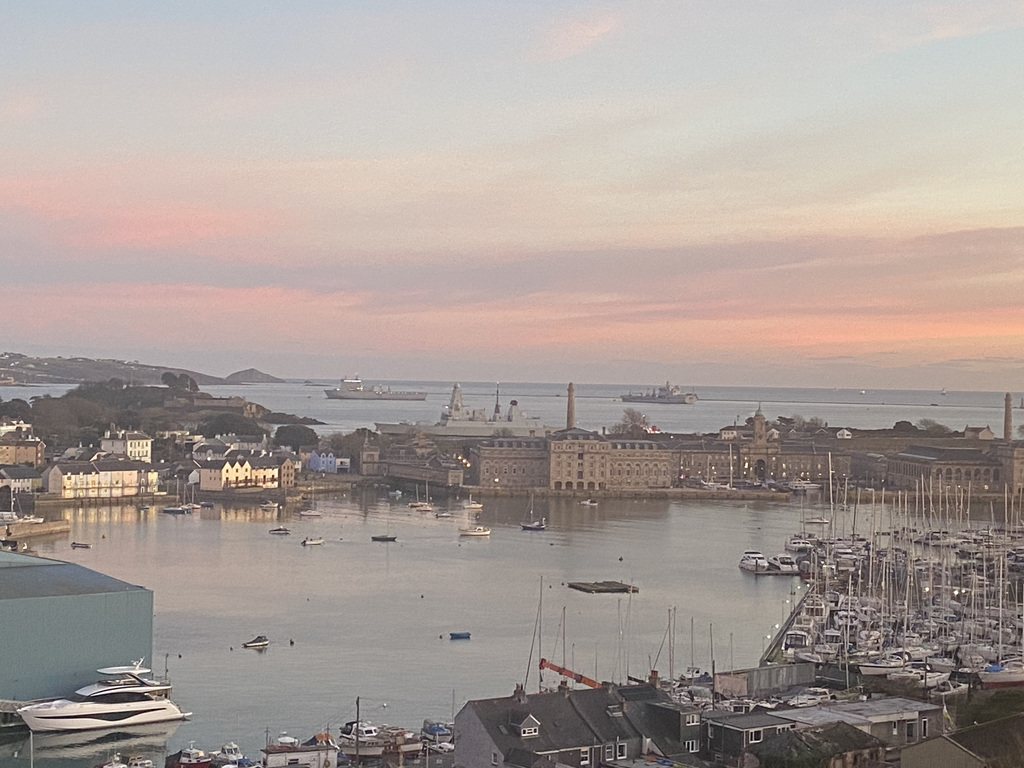 The view is the apartment's defining feature and, importantly, it isn't a static backdrop. The immediate impression is of light and panorama. A south-facing aspect combined with full height glazing draws the day right through the rooms, from crisp morning brightness to dusk, when the city begins to glow and lights across the water create a particularly atmospheric evening scene. It's a broad, wrap-around perspective that rewards time spent looking, the city's roofline and church towers giving way to the green edge of Dartmoor, Plymouth Sound opening towards The Hoe and Drake's Island, the Royal William Yard and breakwater, and beyond, the Cornish countryside catching the last of the sun. There is constant movement within the frame: naval vessels working the deep-water channel, ferries coming and going, weather fronts rolling across the water, and weekends punctuated by play at Plymouth Cricket Club. It's the kind of outlook that gently enriches everyday.