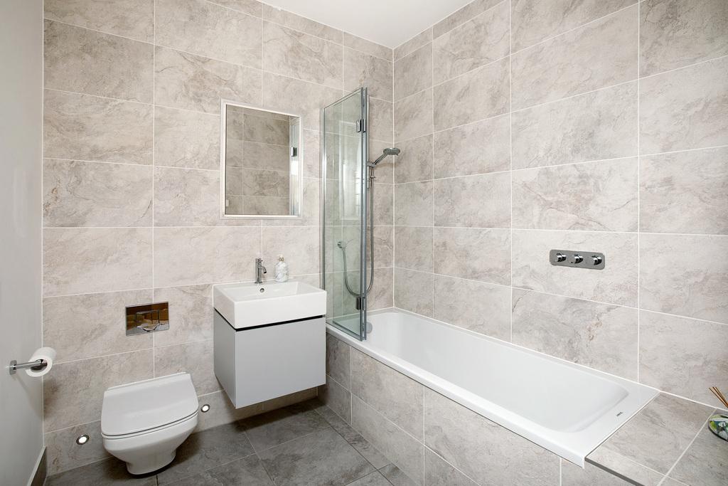 The principal bedroom continues the apartment's sense of scale and aspect, with glazing to two sides, terrace access, fitted cabinetry and an en suite with a full-width walk-in shower, heated towel rail and twin basins. Two further double bedrooms provide flexibility, one currently arranged as a study, and are served by a stylish family bathroom.