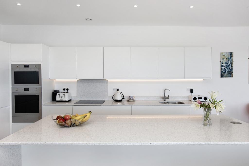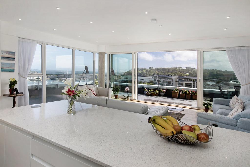 The living accommodation is arranged around the panorama. A generous open-plan sitting and dining room is edged by dual-aspect glazing and sliding doors, creating an easy connection to the terrace and making the most of the ever-shifting scene beyond. The kitchen sits comfortably within the space, centred on a quartz-topped island with excellent storage and integrated Smeg appliances, including an oven, microwave, warming drawer, induction hob, dishwasher, fridge freezer and a boiling-water tap.