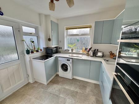 The kitchen is fitted to a high standard with a matching range of base and eye level storage cupboards with quartz work surfaces, Neff induction hob, Neff double oven, integral Neff dishwasher, and space and plumbing for a washing machine, one-and-a-half bowl sink unit with mixer tap, a window to the rear elevation overlooking the garden, a further window to the side, and a doorway leading to the side path, a wall-mounted Worcester combination boiler and a large larder cupboard.