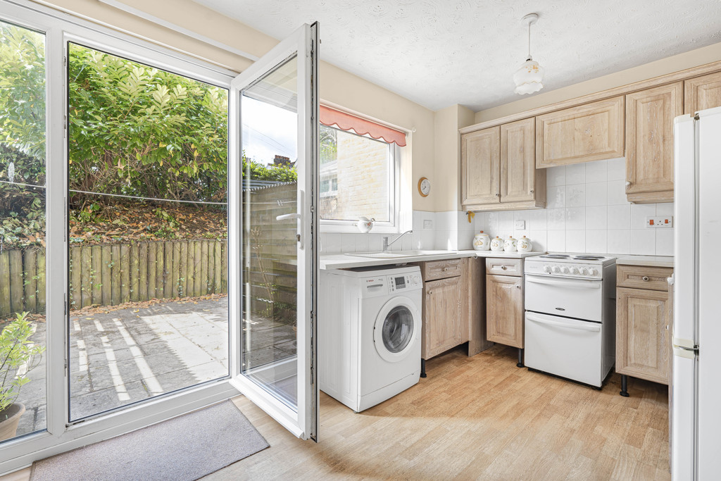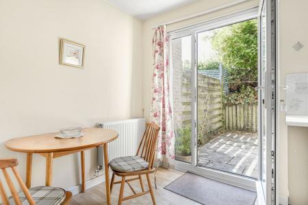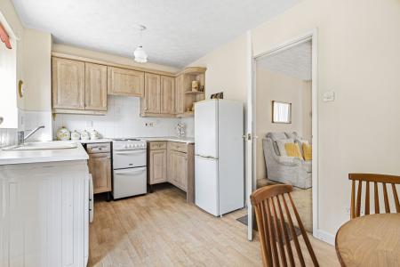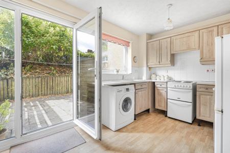 Fitted with a range of lime oak base units and drawers under roll edge work surfaces, matching wall cupboards and tiled surrounds, inset single drainer sink unit with mixer tap, plumbing for washing machine, space for electric slot in cooker with concealed cooker hood over, space for fridge/freezer, radiator, double glazed window to rear, double glazed door with fixed side screen to garden.