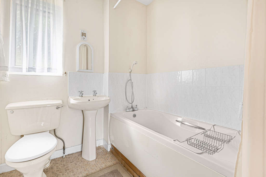 Set comprising panelled bath with mixer tap and shower attachment, part tiling around bath and sink, low flush w.c, pedestal wash hand basin, shaver point, radiator, double glazed window to rear.