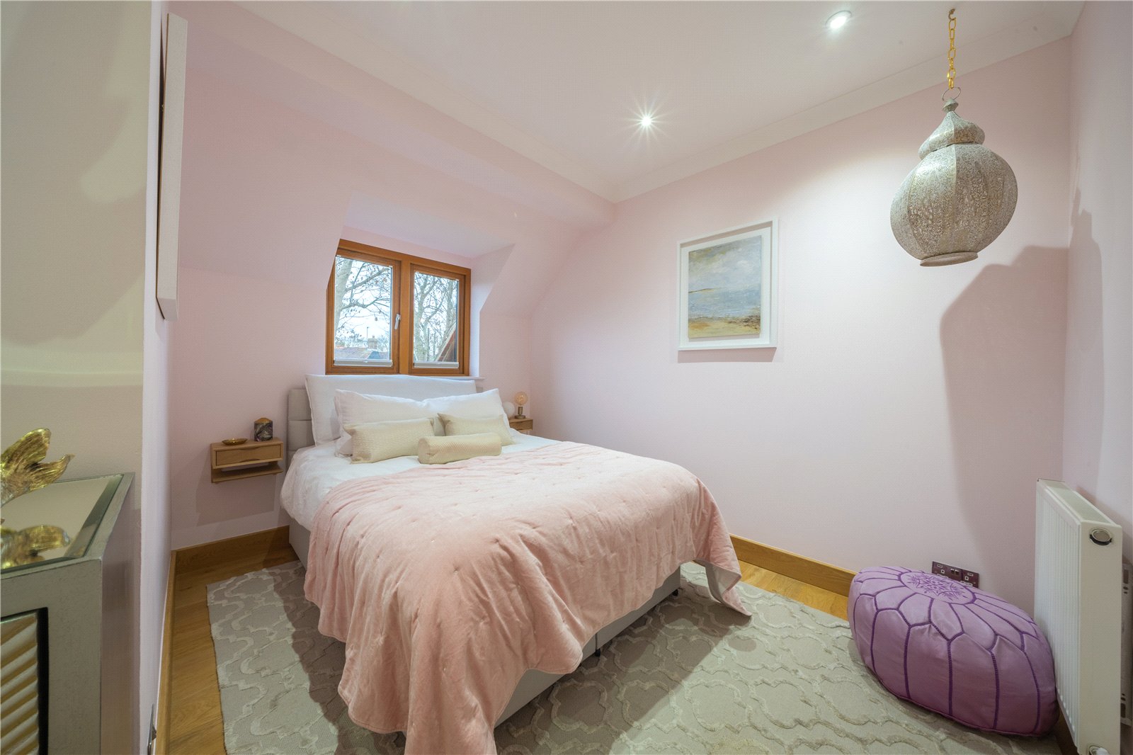 BEDROOM 2: A charming and beautifully styled bedroom finished in soft pastel tones, creating a serene and inviting atmosphere. The room features warm oak flooring and a dormer window that fills the space with natural light while offering a pleasant outlook. Thoughtfully designed with subtle decorative details and a sense of warmth, this delightful room is perfect as a guest bedroom or a peaceful retreat.