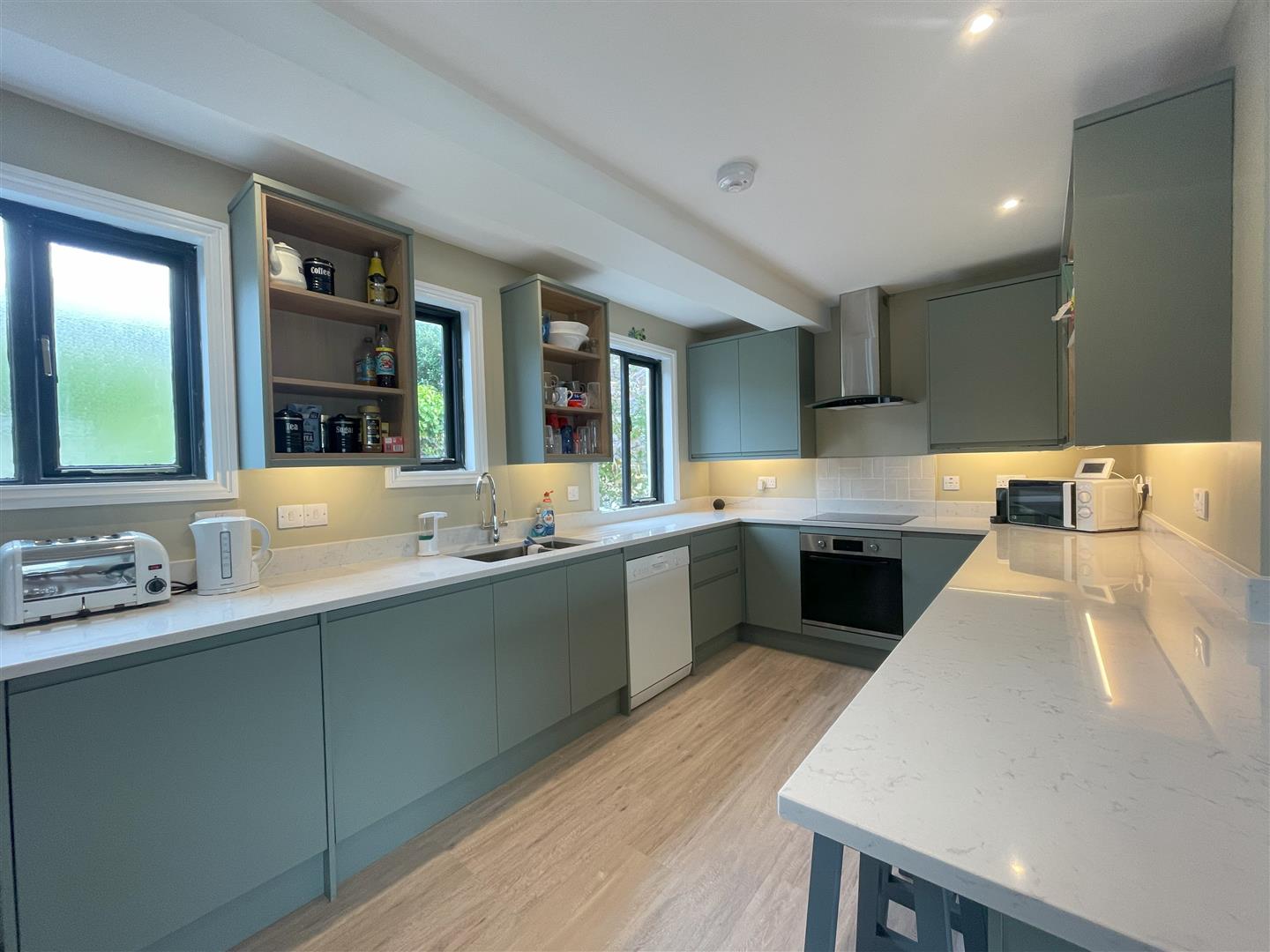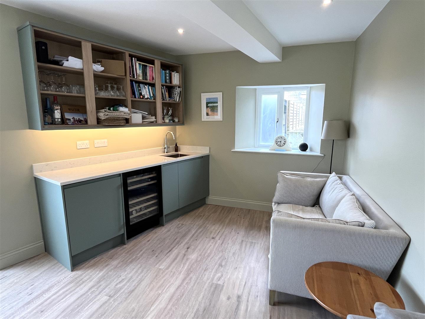 There is a further area with separate sink and drainer, wine fridge and storage cupboards and more than ample space for dining table and chairs.