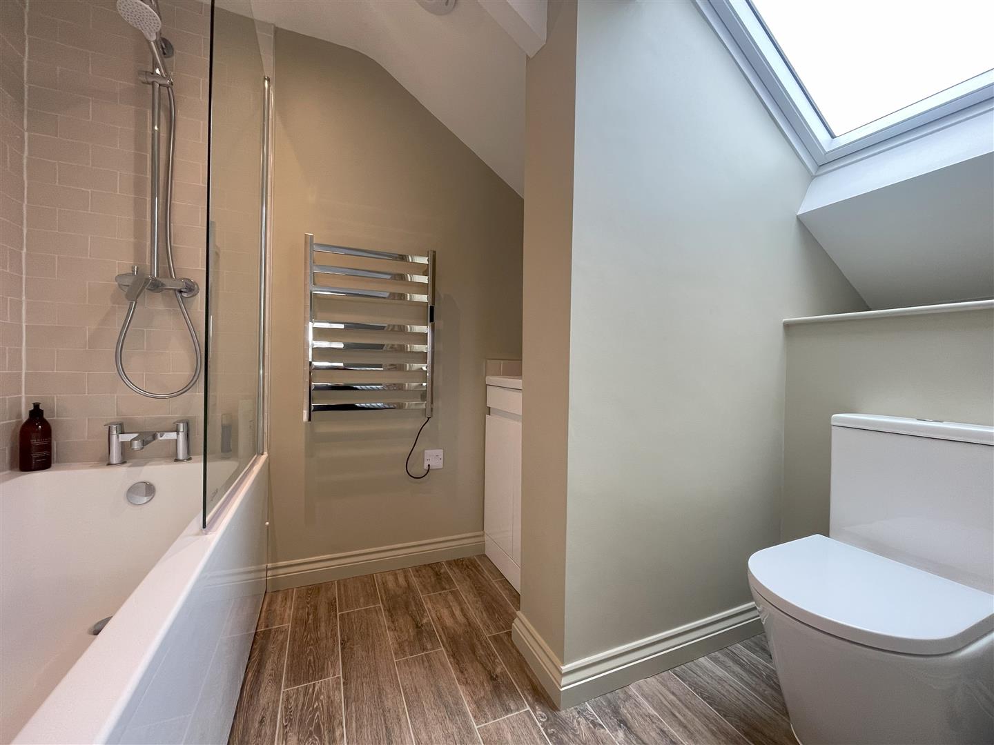 A family bathroom has a panelled bath with shower over, WC and wash basin.