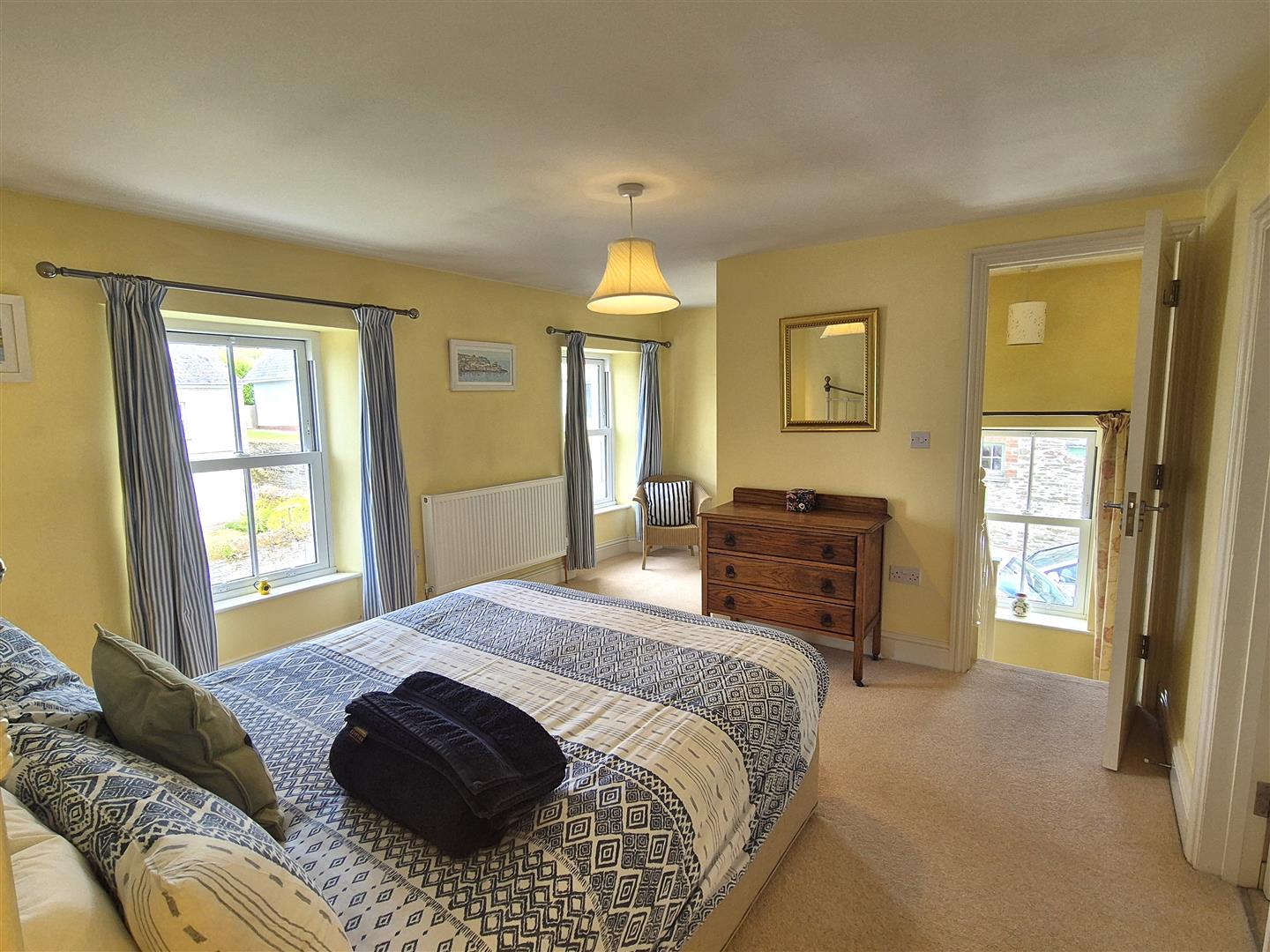 From the sitting room, a staircase rises to a principal bedroom boasting a beautiful and generous en suite comprising of a large shower cubicle, wash hand basin, WC and heated towel rail. A storage cupboard houses the BAXI boiler for the central heating and hot water, along with the water tank. This bedroom is of a very good size and can easily accommodate a king size bed, there is a built in storage cupboard and dual windows let in plenty of light and give views down Fore Street towards the harbour.