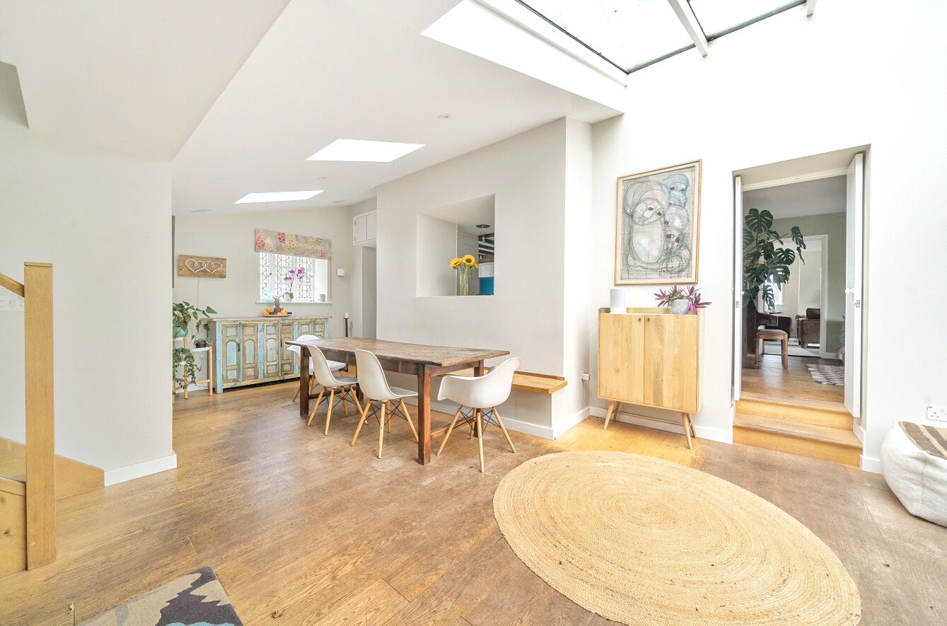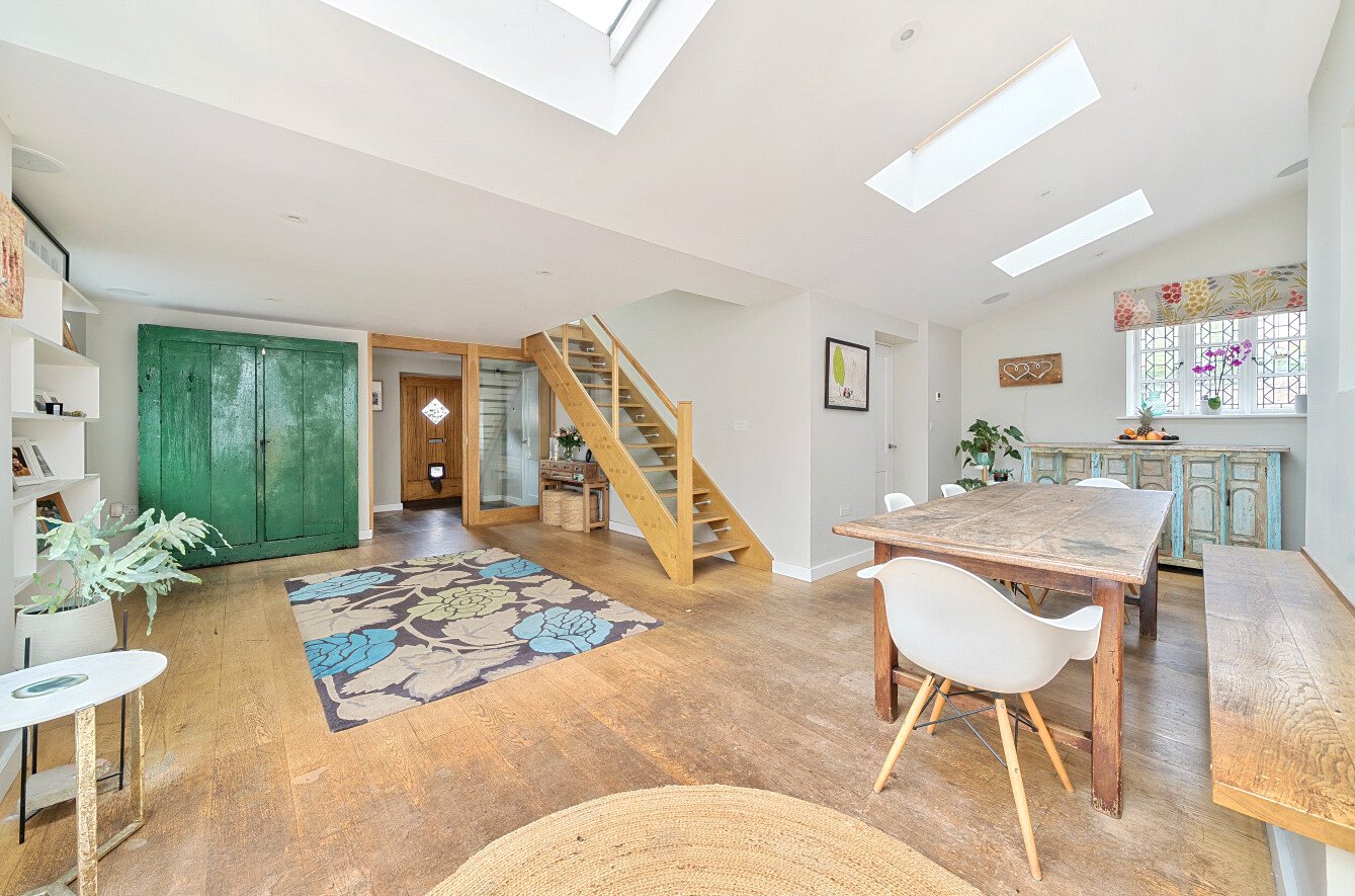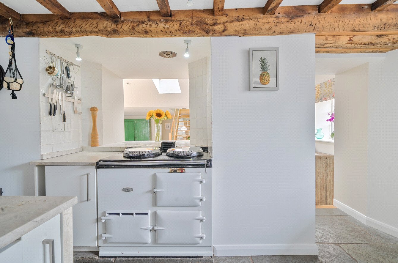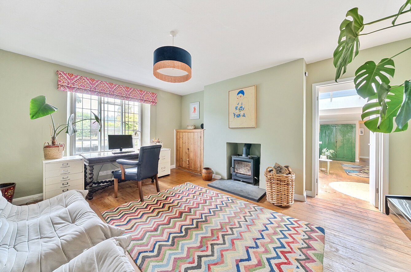 The well-presented accommodation is 1735 sqft with spacious rooms providing a wealth of charm and character including exposed beams, a 20ft sitting room with wood flooring, a dual aspect drawing room with an attractive fireplace and double doors opening onto the gardens. There is a generous sized office also enjoying views of the gardens with a wood burner whilst the kitchen has a range of units, flagstone flooring, an electric Aga and integrated dishwasher and fridge. There is also a separate utility, ground floor WC and shower room. A feature of the property is the fabulous, light 25ft dining/family room, a great entertaining open plan space with sliding doors opening onto the gardens. Two staircases give access to the five double bedrooms and two first floor bathrooms.