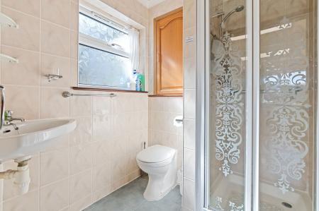 Fully tiled shower cubicle with thermostatic shower and glazed screen, fully tiled floor and walls, built in cupboard housing hot water tank, concealed cistern WC, corner wash hand basin and side double glazed UPVC window.