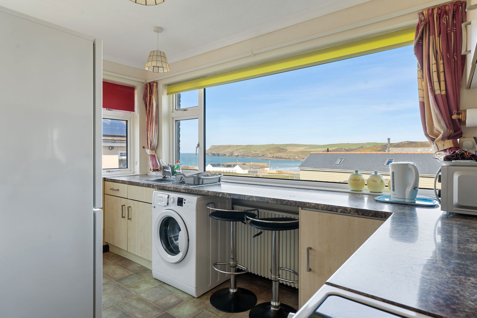 Picture window framing magnificent views towards the beach and Pentire Head. Single drainer stainless steel sink, good range of built in base and wall cupboards, breakfast bar, electric radiator, space and plumbing for washing machine, further recess to side, recess for electric cooker, larder cupboard, serving hatch to