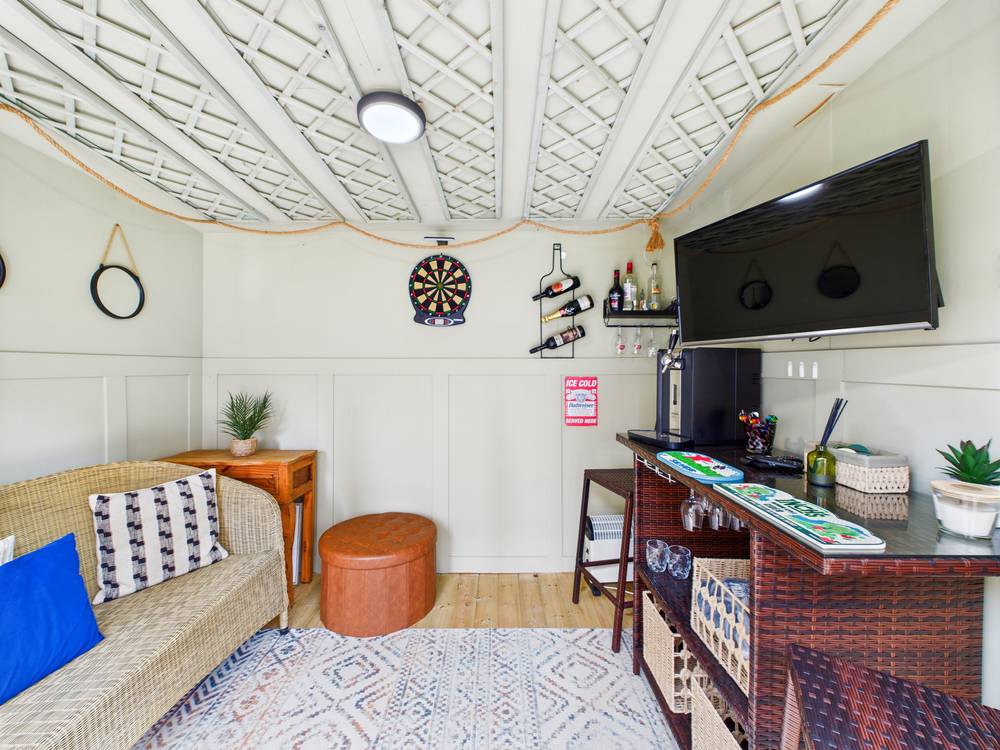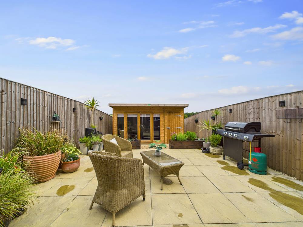 Exterior Rear The rear garden is half paved and half laid to lawn having plenty of space for garden furniture. To the rear, there are stunning, views of fields. There is built summer house with full power and side storage.