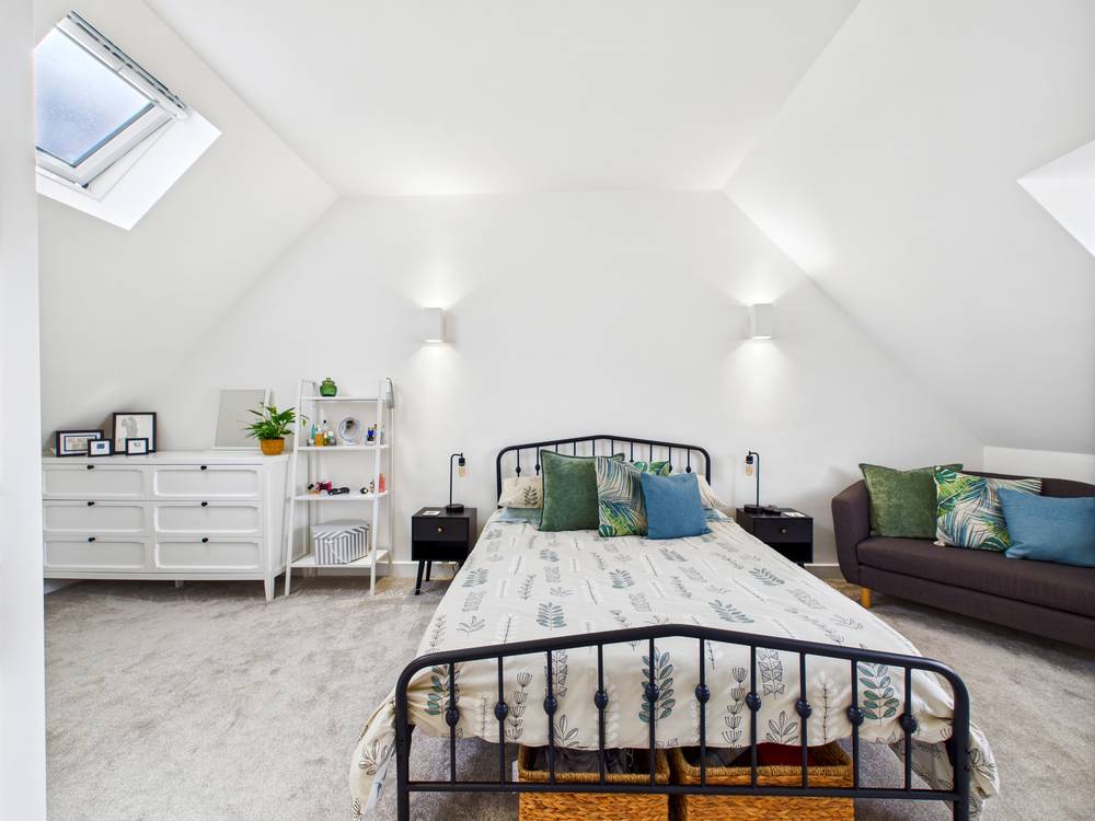 Main Bedroom White uPVC velux window to the rear elevation and a white uPVC double glazed window to the front elevation. Twin panel central heating radiator and door to the En-Suite.