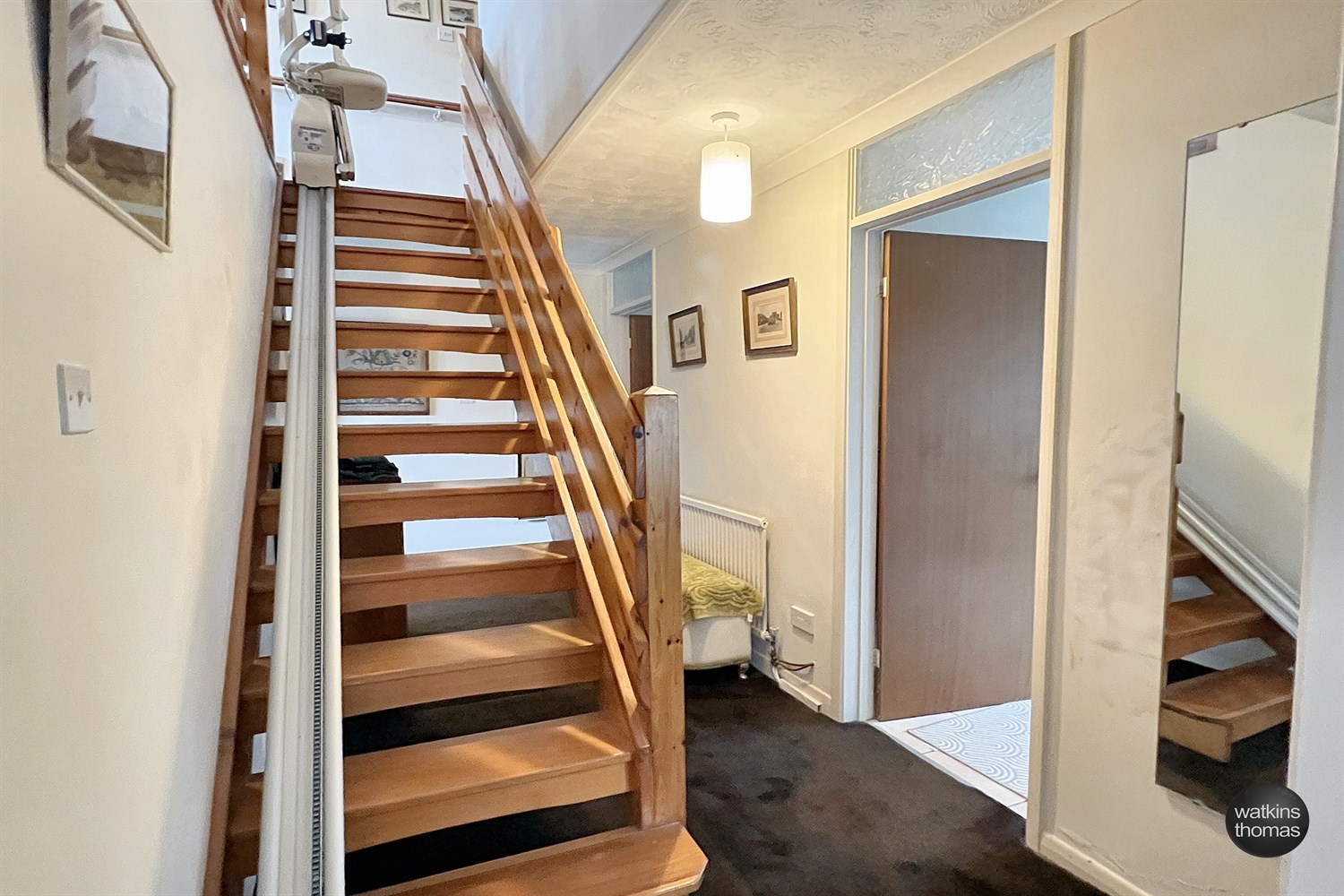 Approached through a double glazed door, access hatch to loft space, wall mounted thermostat, radiator and with doors to the dining room, kitchen/breakfast room, sitting room, cloakroom and over-stair cupboard with slatted shelves. Radiator and stairs to lower floor.