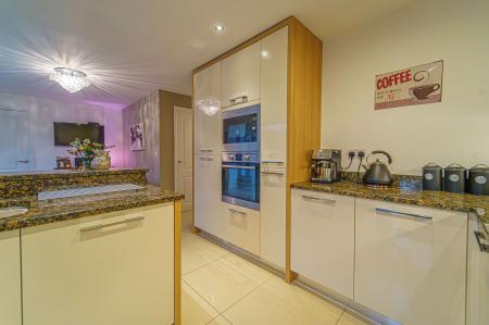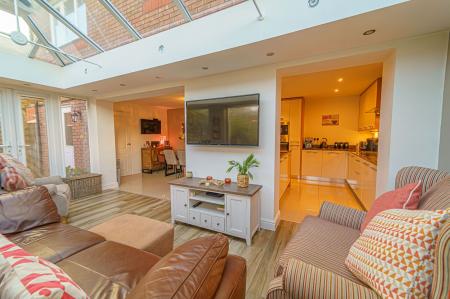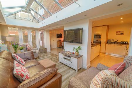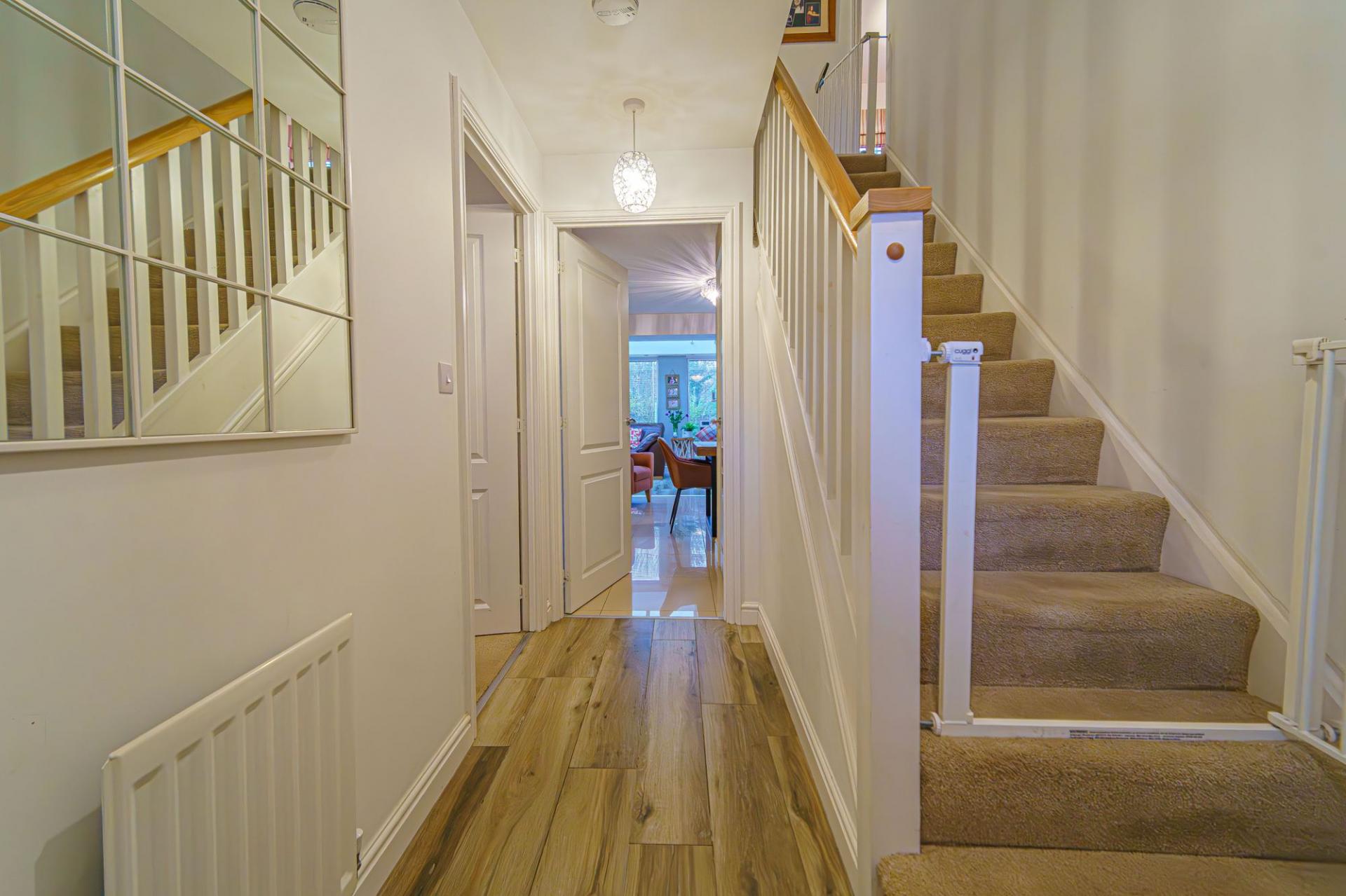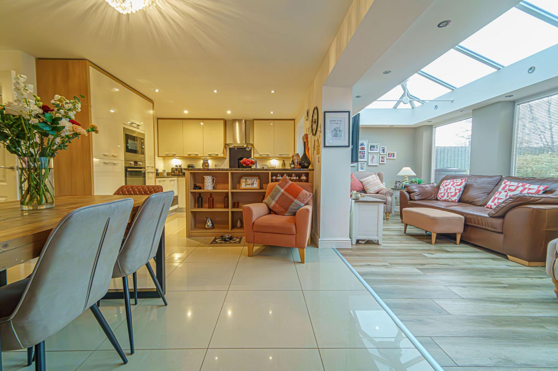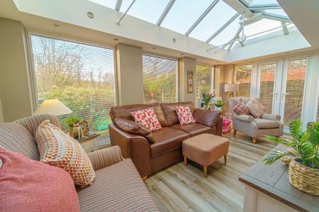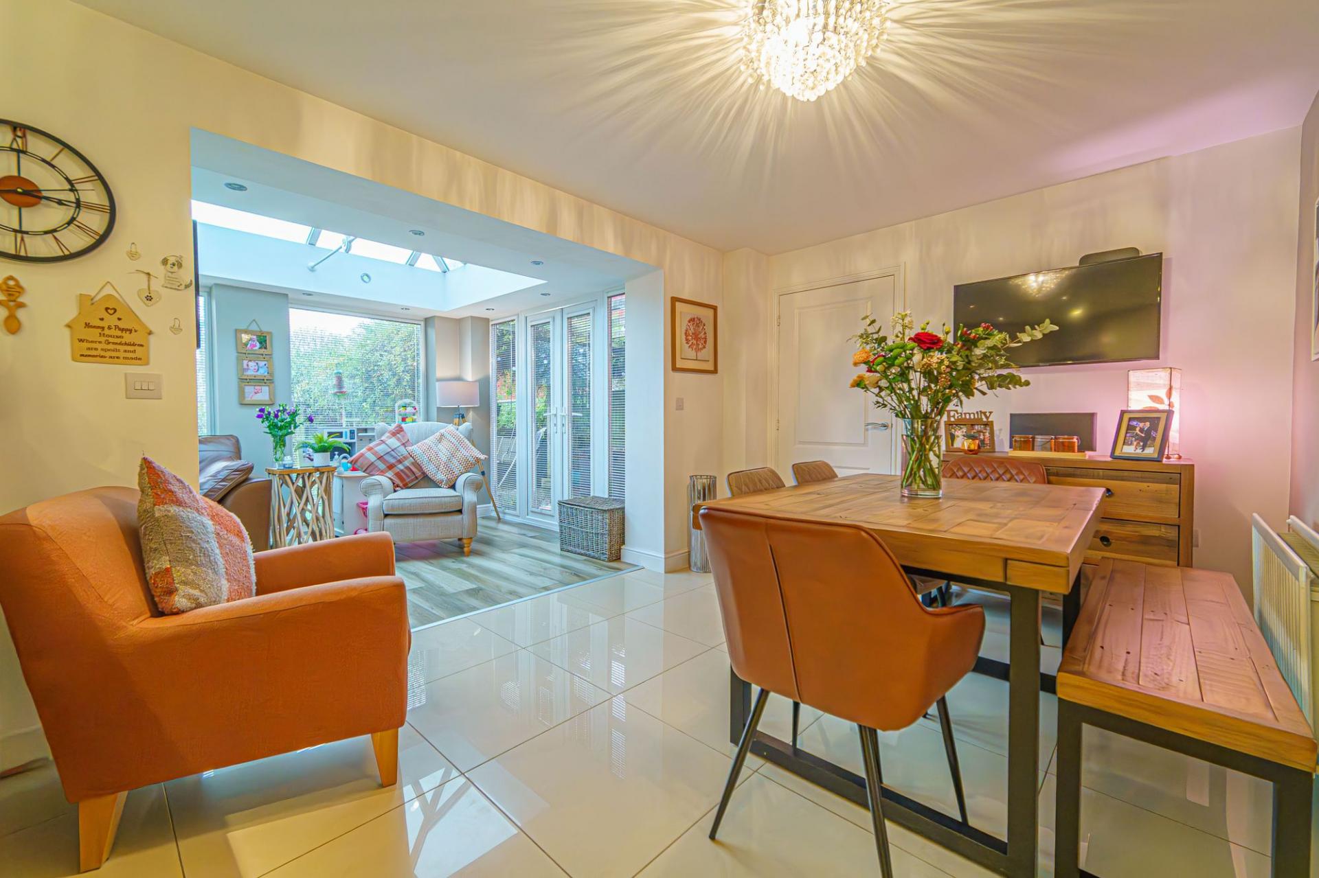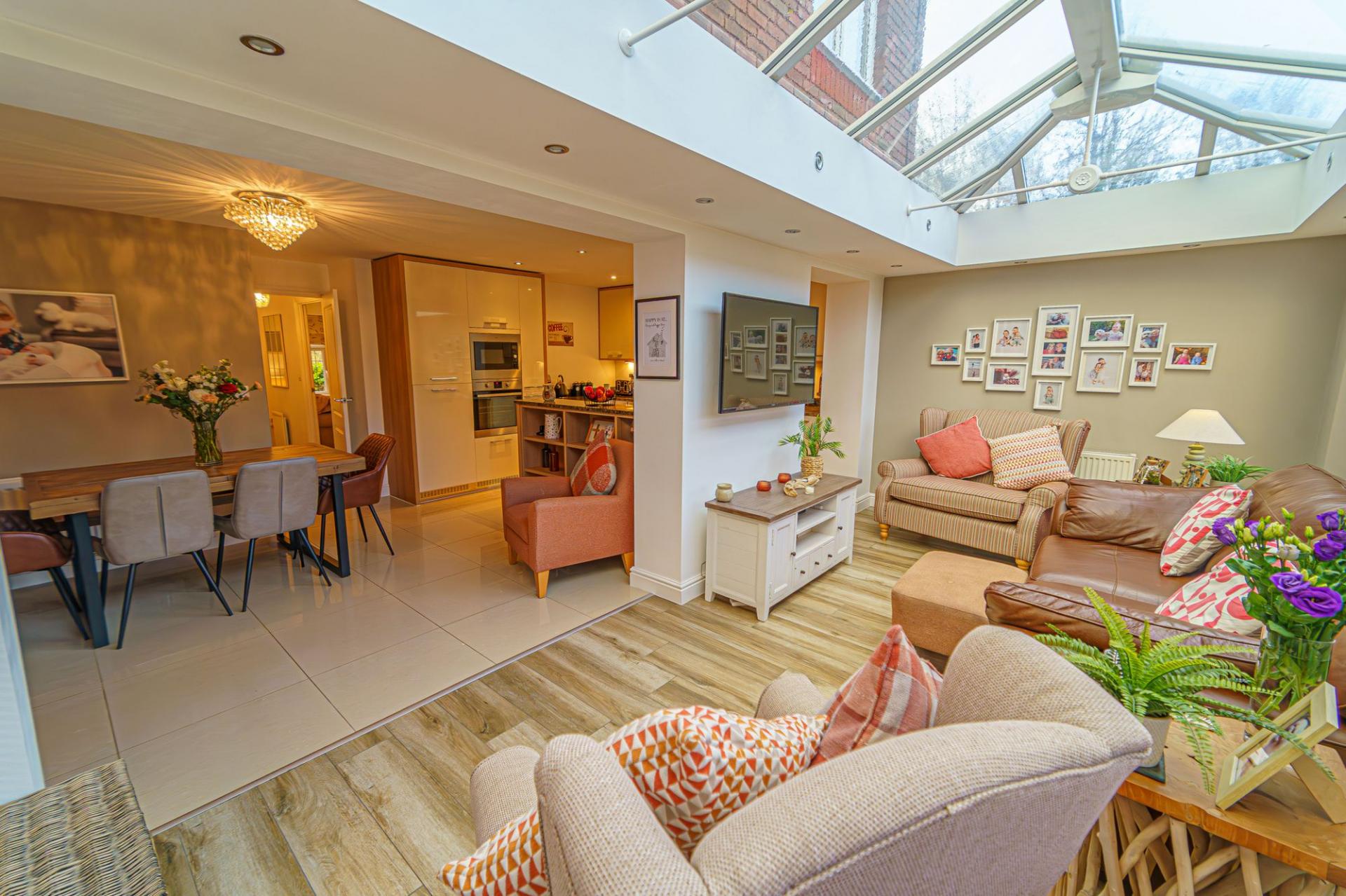 We enter this lovely family home through the front, where we are taken through the entry hallway and into the spacious living room, fitted with a charming fireplace and lit up from bay front windows. Continuing through the property we come to the magnificent kitchen, which boasts and open plan design to the neighbouring dining room, while both rooms being connected to the stunning extended conservatory at the rear of the house, flooded by natural light through windows on all angles, including doors to the garden. The conservatory presents itself as a wonderfully multi-functional space, currently in use as an extra living space, but could also be used as an alternative dining room in the bright summer months, while also fitted with a radiator to ensure warmth all year round. The kitchen itself is very well equipped with granite work tops throughout and many storage options. This includes integrated appliances including a four-ring hob, oven and grill, microwave, fridge freezer and dishwasher. There is also room for both washing and drying machines in the neighbouring utility room, which also has a W.C adjacent, and additional space in a storage cupboard under the staircase.
