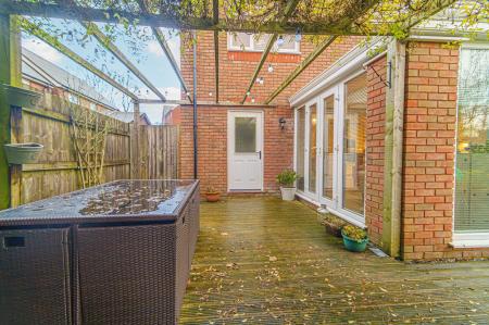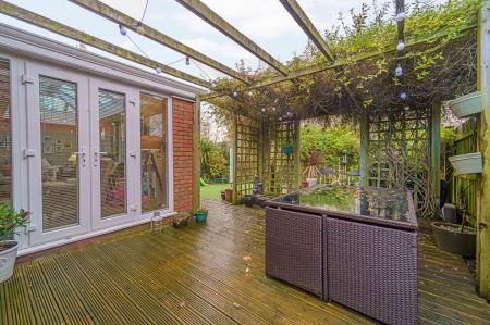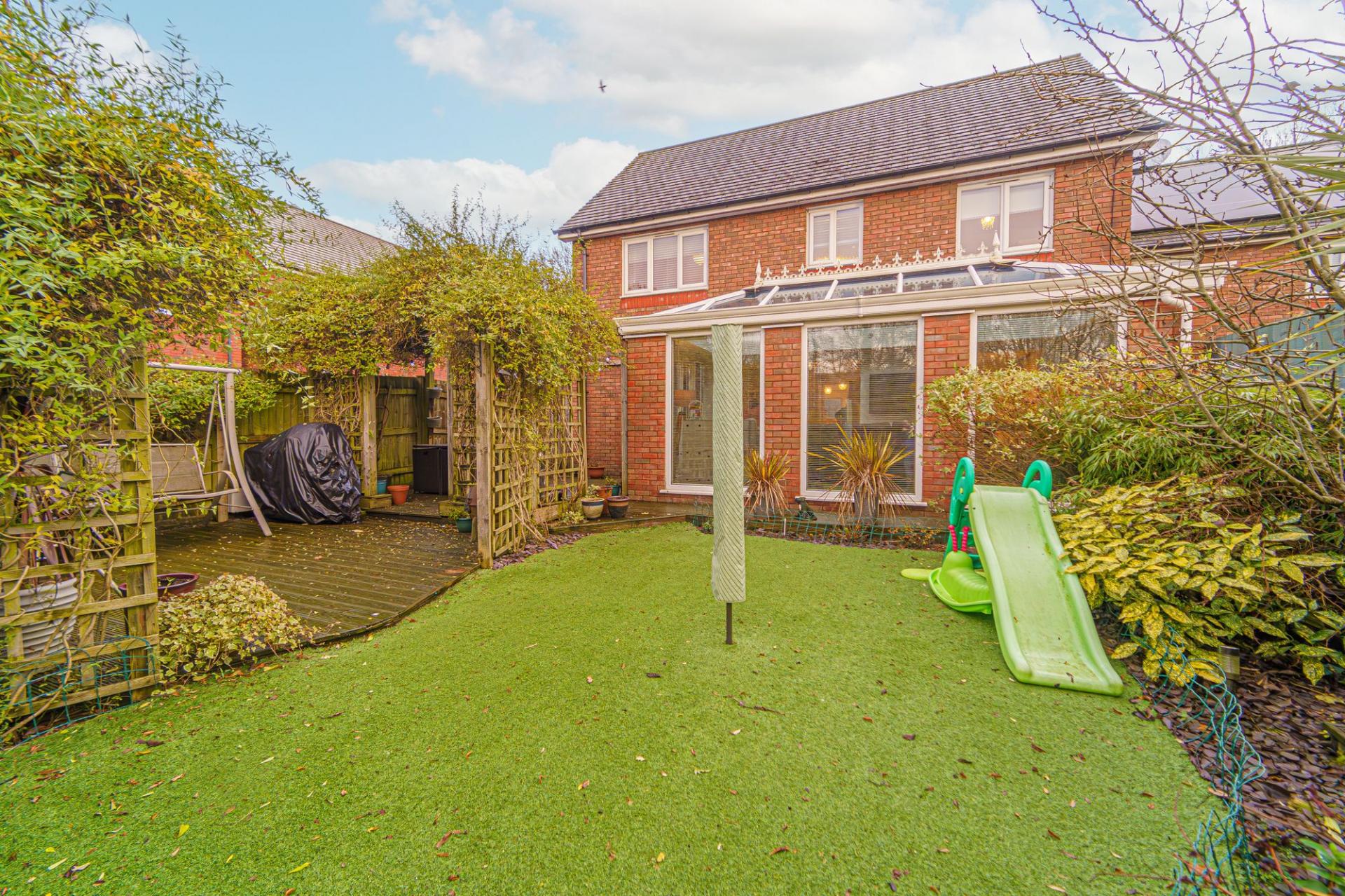 Stepping outside we have the fully enclosed rear garden, with a wooden deck that extends from the house partially sheltered by a charming pergola. Beyond the decking we have a well size low maintenance Astro turf lawn, adorned by a lovely array of shrubs to create a balance of low maintenance with natural touches, perfect for welcoming guests for various garden activities. A pathway to the side of the house connects us to the double drive which can park two vehicles off-road, as well as access to the garage which can park an additional vehicle and provide great overflow storage. The property is also tucked away down a secluded drive, shared by only one other neighbouring house, meaning a complete absence of through traffic and ensuring privacy for the prospective homeowners.