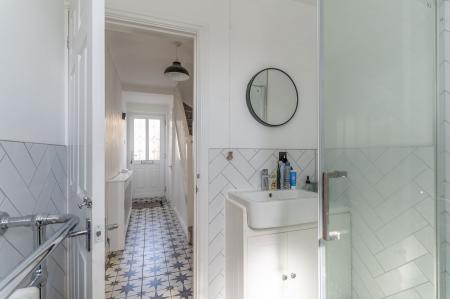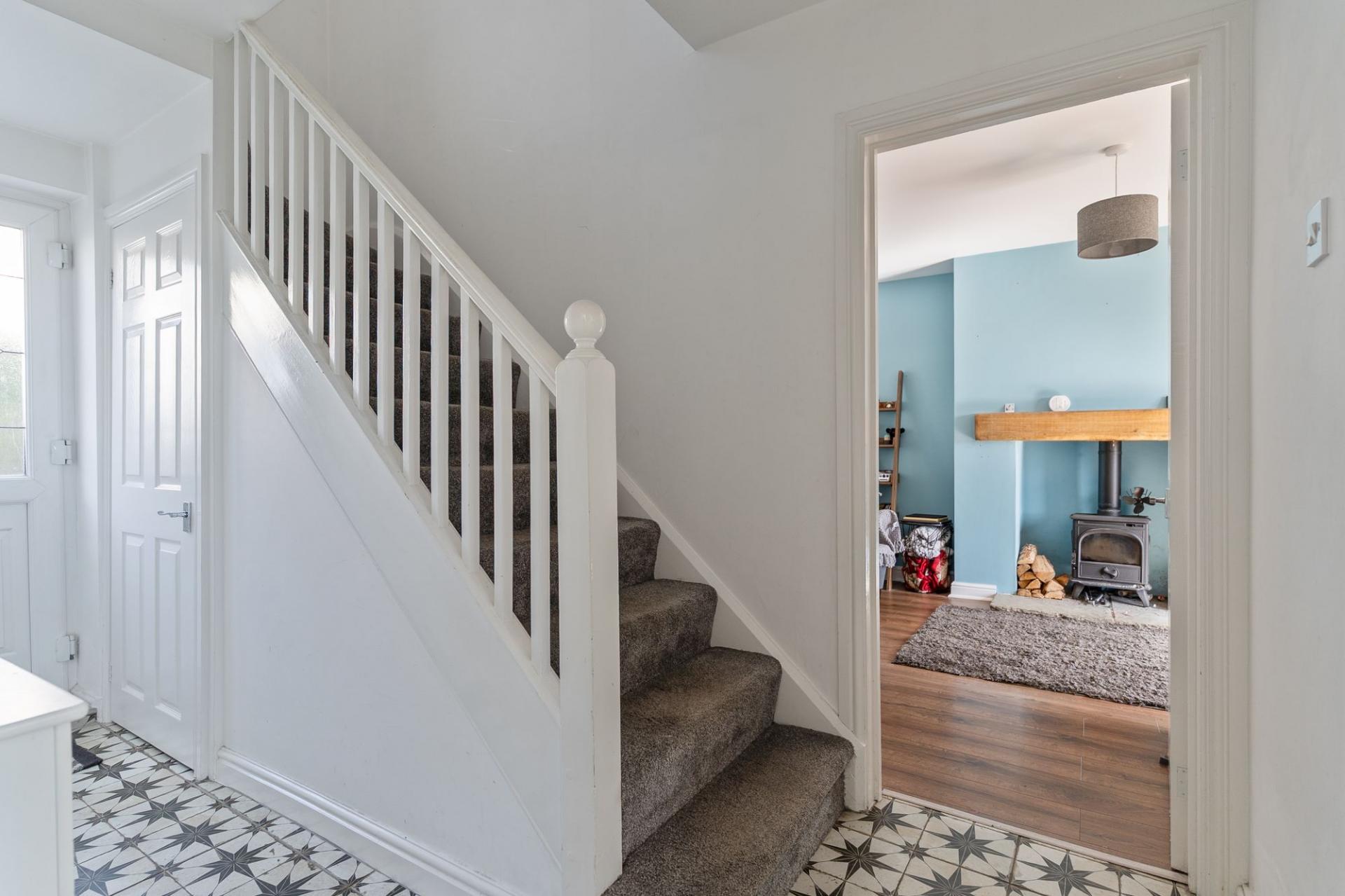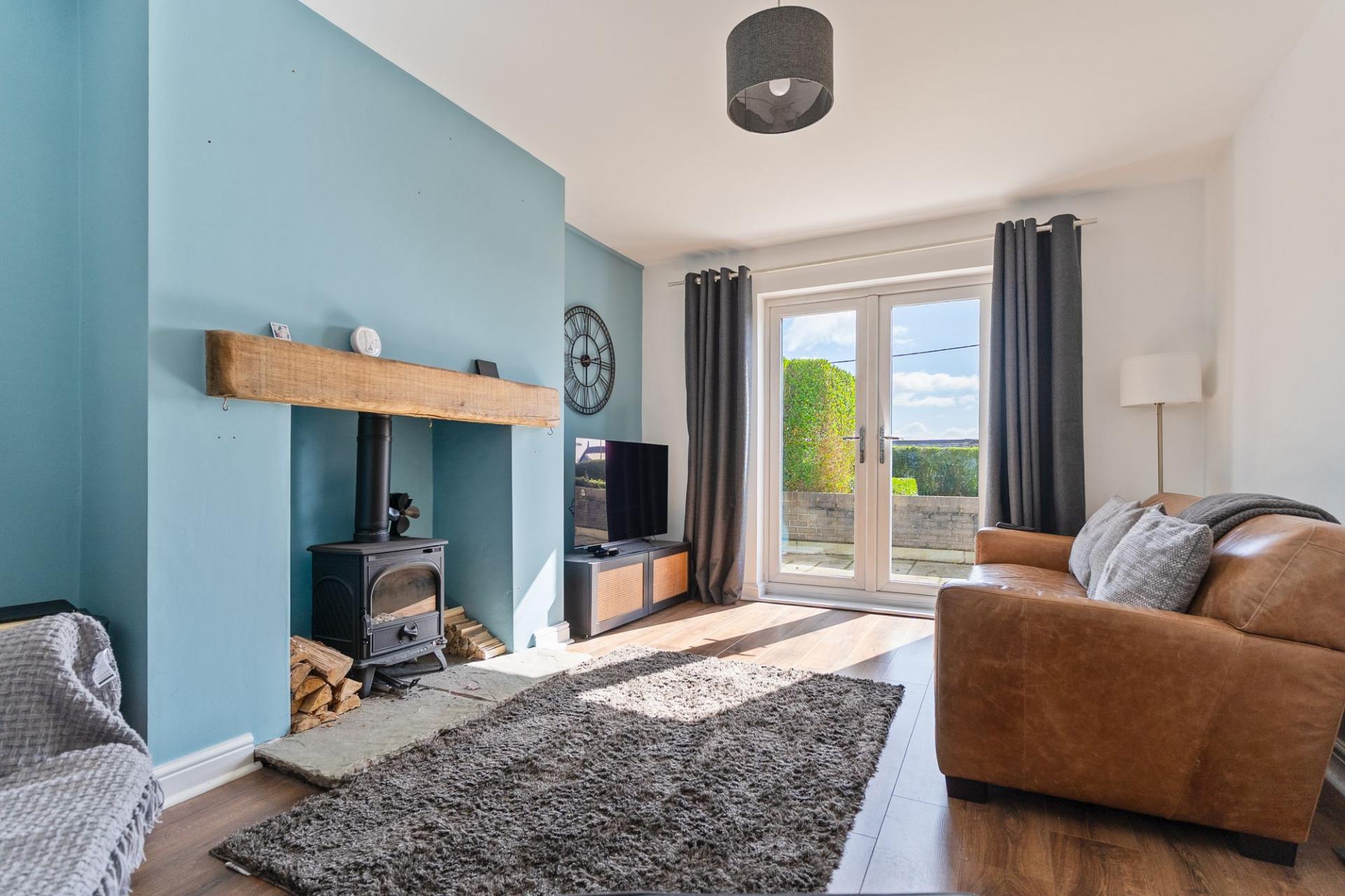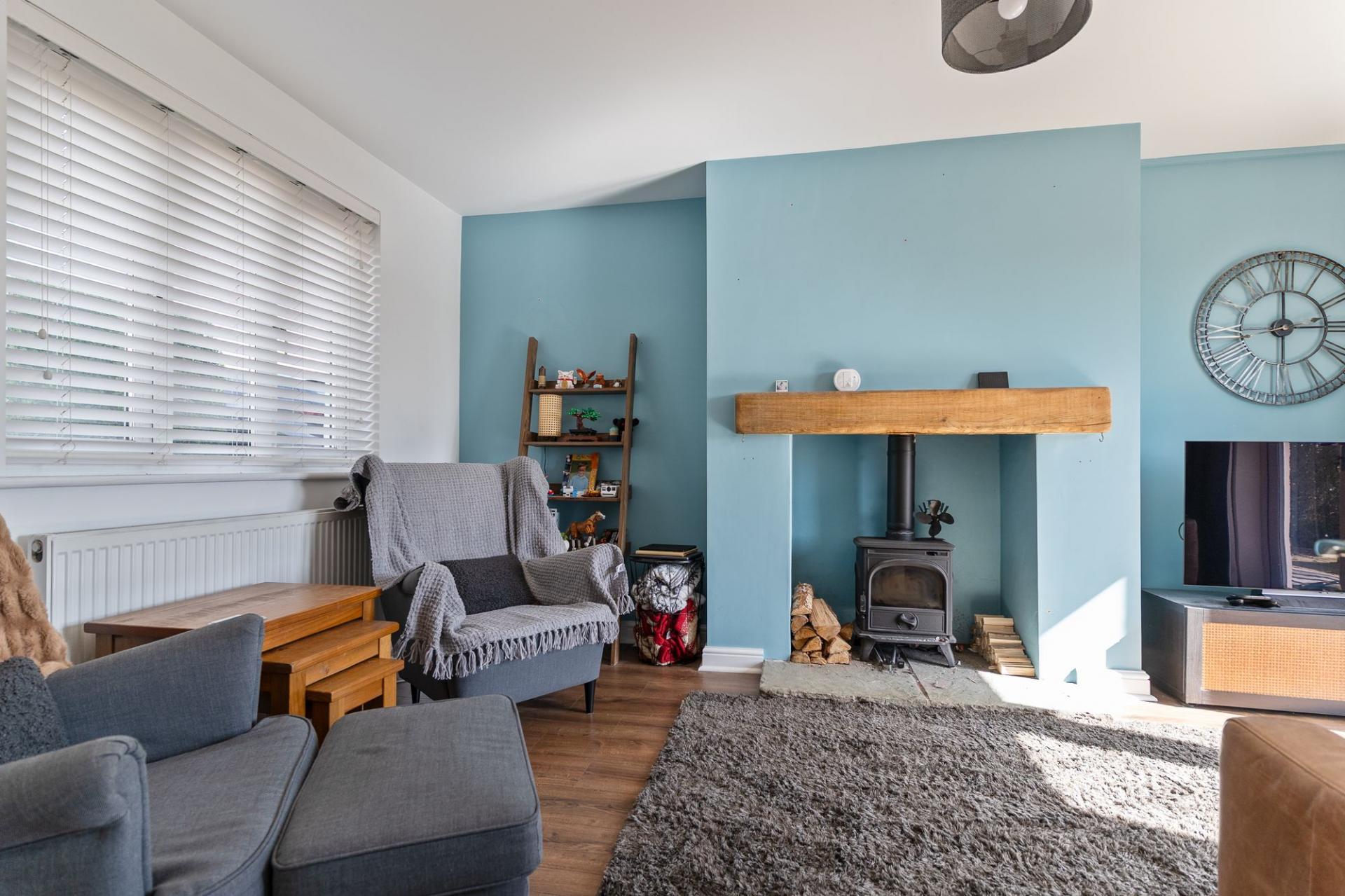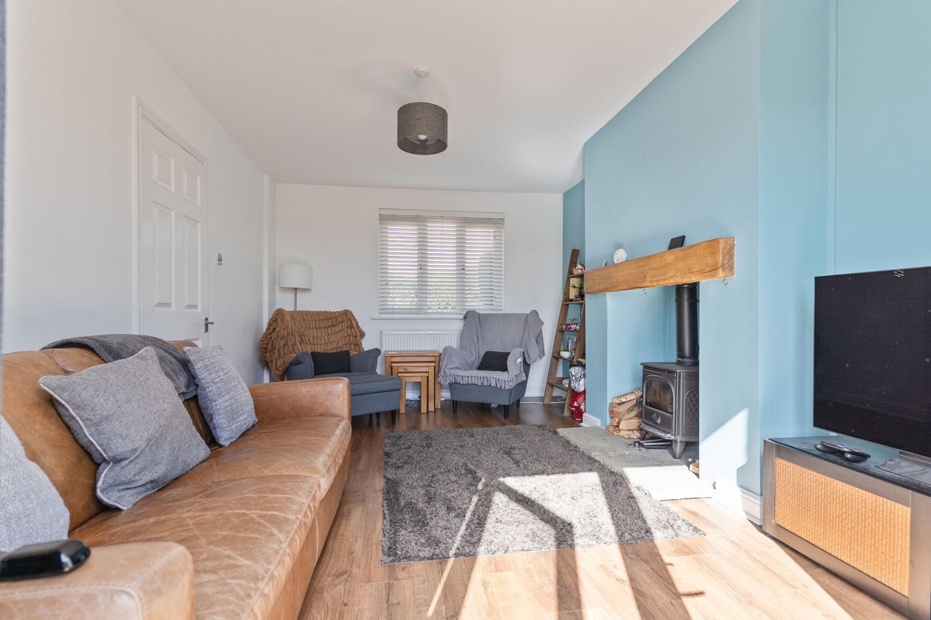 You enter the property through the hallway, which provides access to the main ground floor living areas, a modern ground floor shower room and the staircase leading to the first floor. To the right is the open plan kitchen and dining room, featuring a modern cottage-style kitchen with ample storage and workspace, along with plenty of room for a dining table. This space also benefits from access out to the rear garden. To the left is the stylish living room, centred around a feature log burner fireplace, creating a warm and inviting atmosphere. The room also benefits from patio doors opening out to the rear garden, allowing for a bright and airy feel.