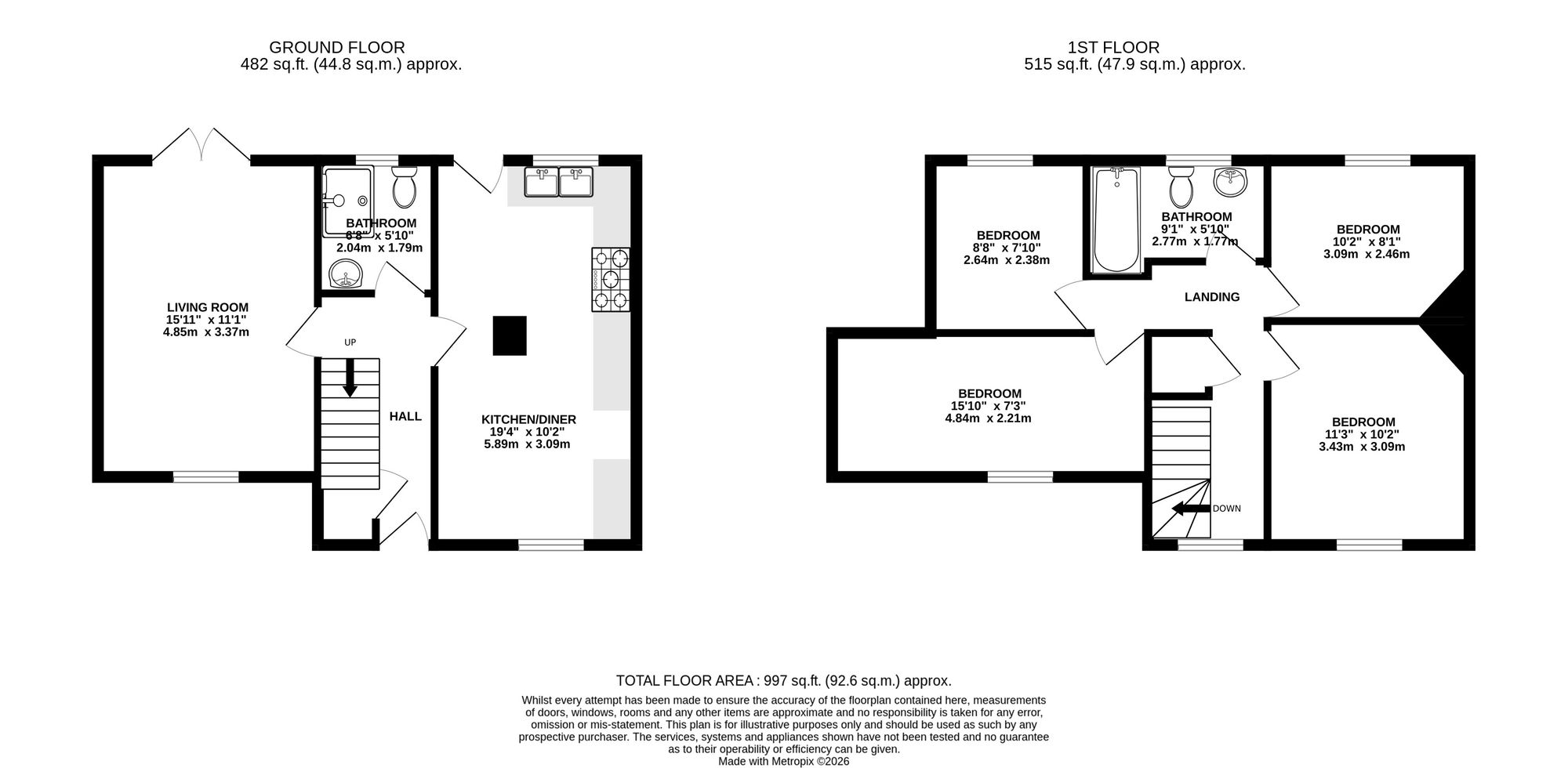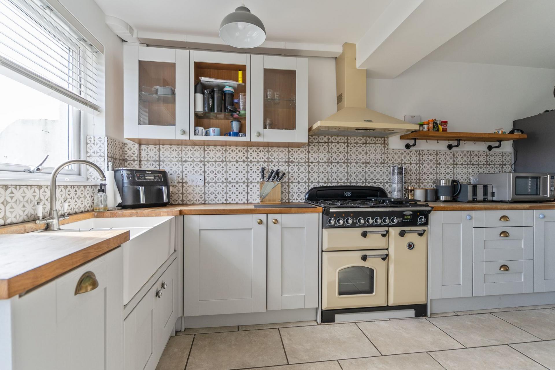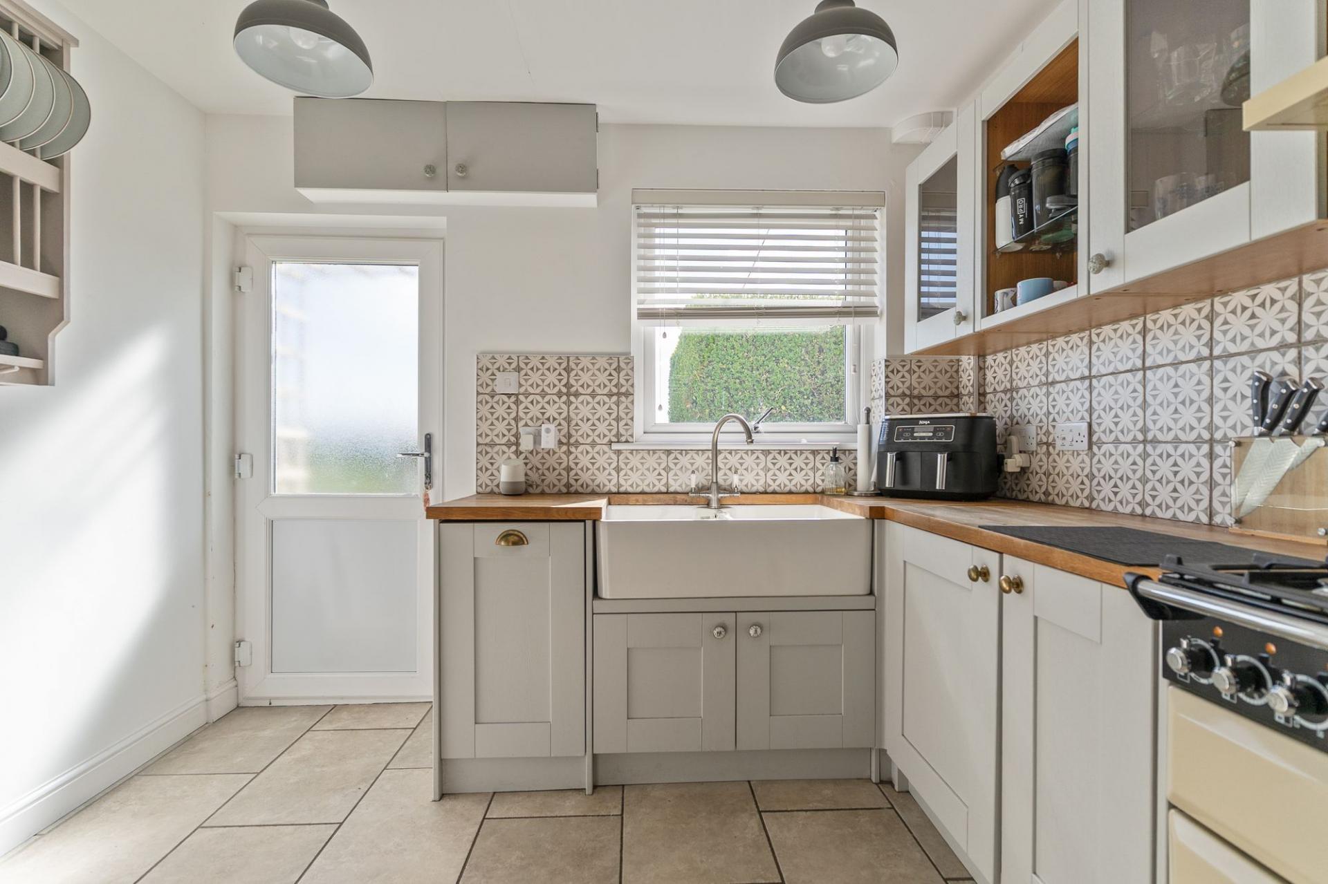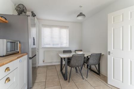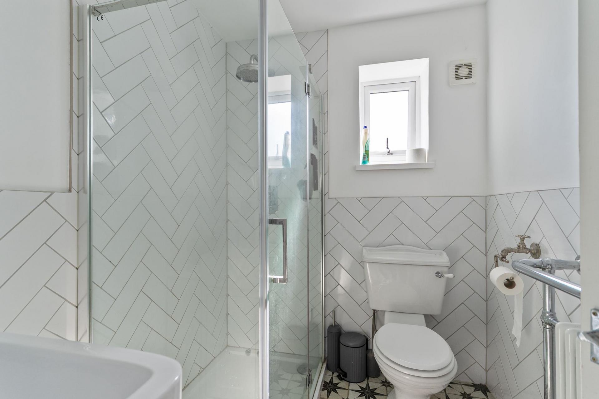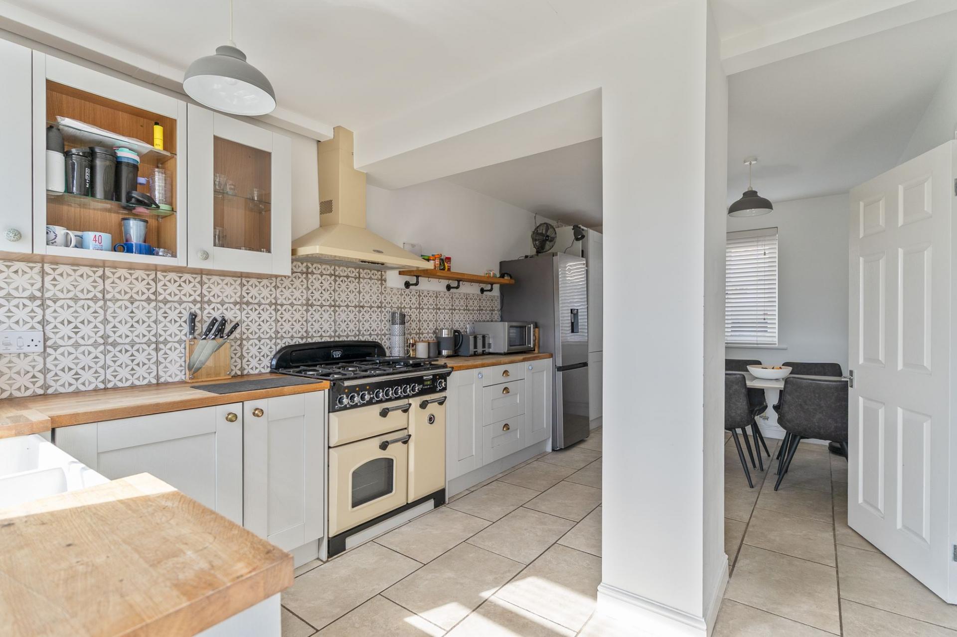 You enter the property through the hallway, which provides access to the main ground floor living areas, a modern ground floor shower room and the staircase leading to the first floor. To the right is the open plan kitchen and dining room, featuring a modern cottage-style kitchen with ample storage and workspace, along with plenty of room for a dining table. This space also benefits from access out to the rear garden. To the left is the stylish living room, centred around a feature log burner fireplace, creating a warm and inviting atmosphere. The room also benefits from patio doors opening out to the rear garden, allowing for a bright and airy feel.