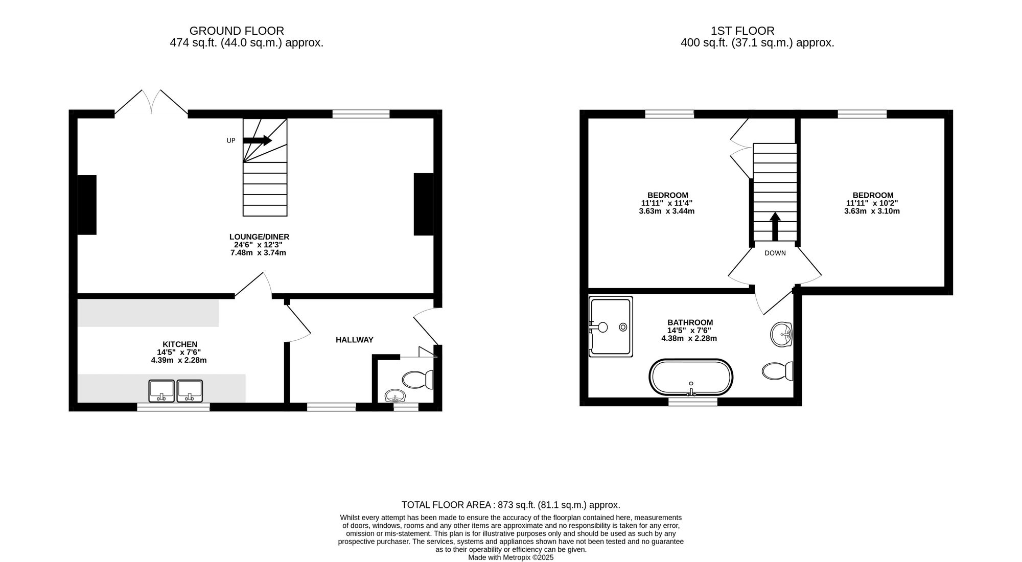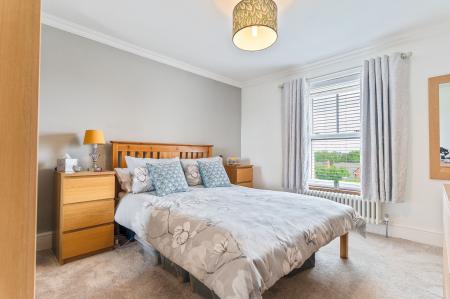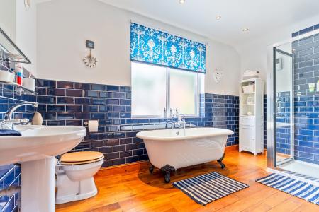 The first floor hosts two generously sized double bedrooms, each with space for freestanding furniture and bathed in natural light. The accommodation is completed by a luxurious and spacious family bathroom, boasting a freestanding roll-top bath, a large walk-in shower, and stylish contemporary fittings — perfect for unwinding at the end of the day.