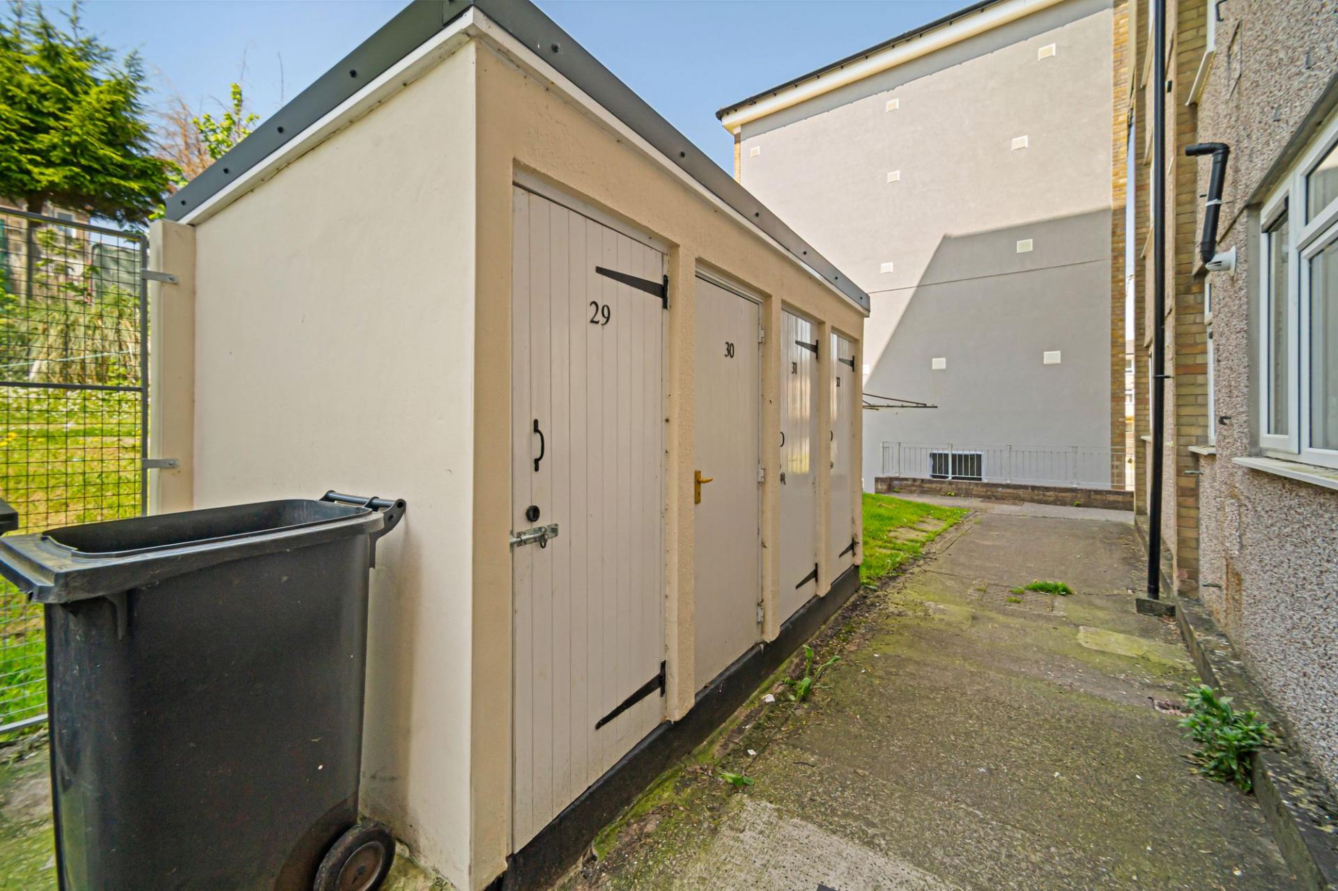 Stepping outside the apartment, we can find a useful storage shed allocated to the property, accessed from the hallway right outside the front door. Another allocated storage space is found to the rear of the building, as well as a residential car park.