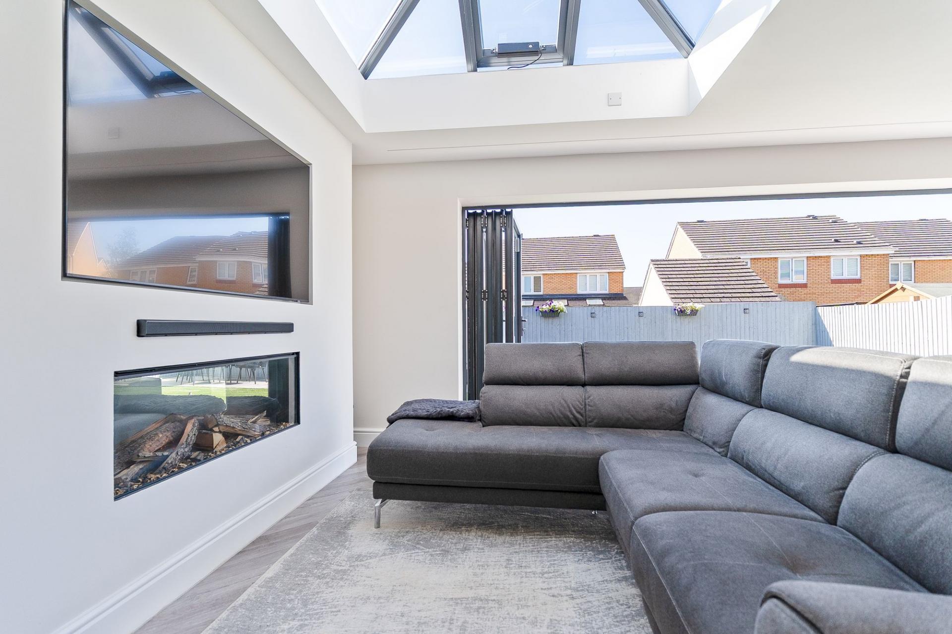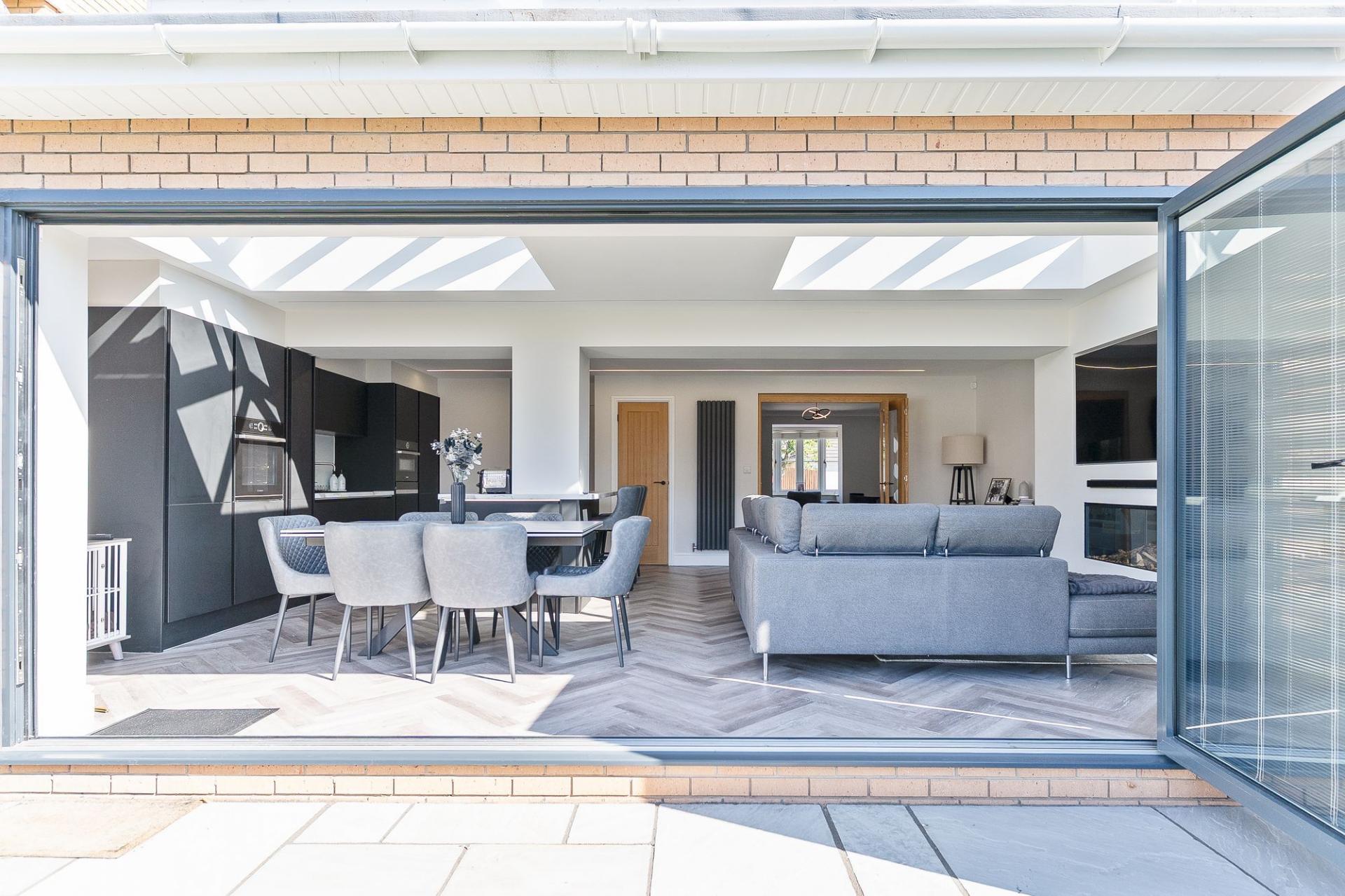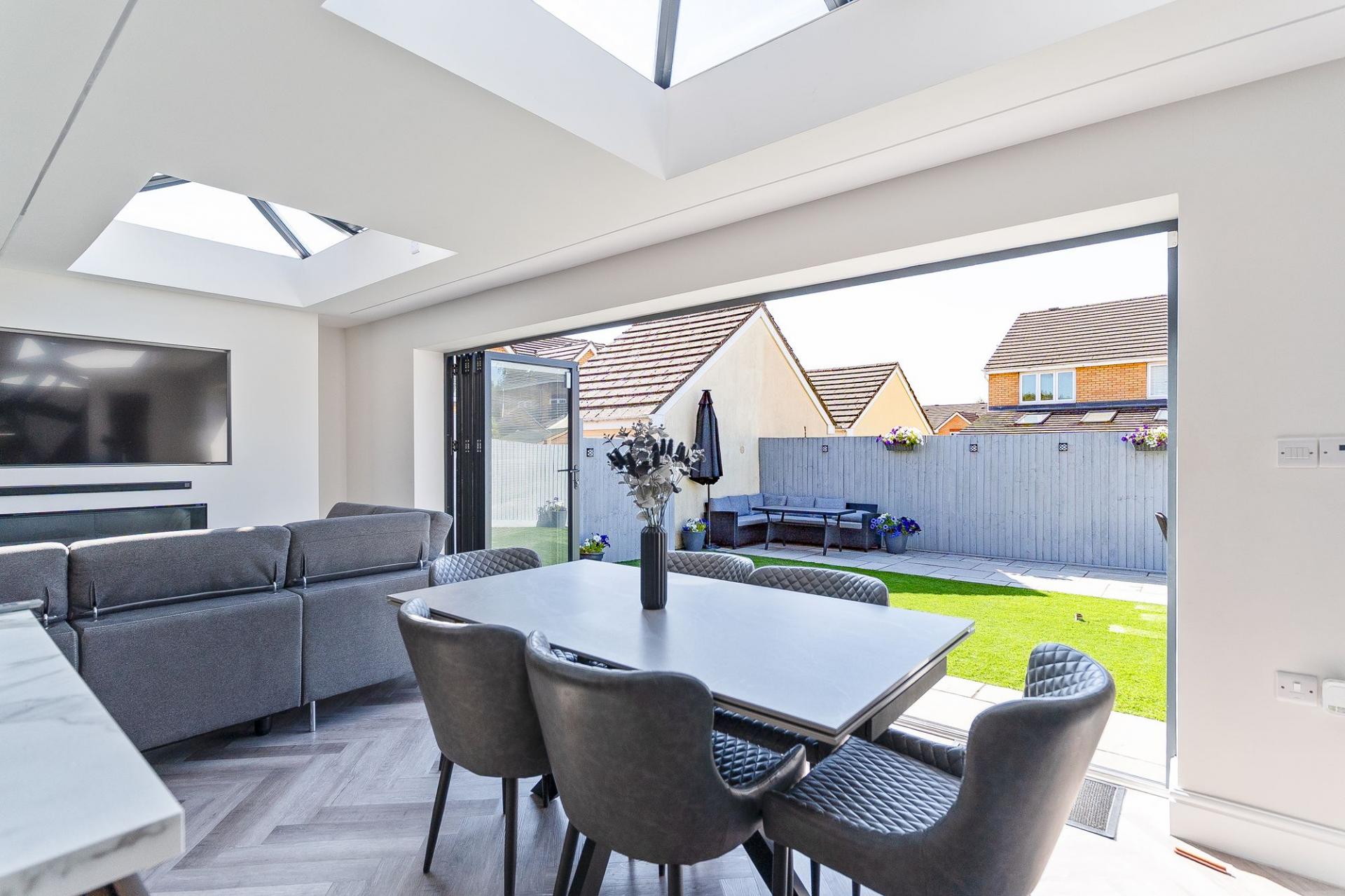 Upon entering the property, the hallway leads into the main living space, which is bright and stylishly finished, featuring a bay-fronted window that fills the room with natural light. Modern folding doors open into a stunning extended family room—an impressive open-plan space that forms the heart of the home. The contemporary kitchen is fitted with a sleek range of units, integrated appliances, and a large central island with a breakfast bar, making it ideal for both everyday use and entertaining. Two skylight windows and large bi-folding doors along the rear flood the space with natural light, creating an airy and inviting atmosphere, with ample room for a variety of seating and dining arrangements.