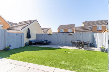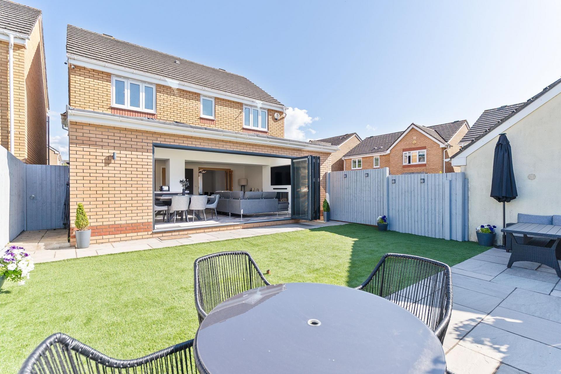 To the front of the property, a large driveway provides off-road parking for multiple vehicles. The rear garden has been beautifully landscaped to include a patio seating area and a level lawn—perfect for outdoor dining, entertaining, or relaxing with the family. The space offers a great degree of privacy and is ideally suited for those who enjoy spending time outdoors.