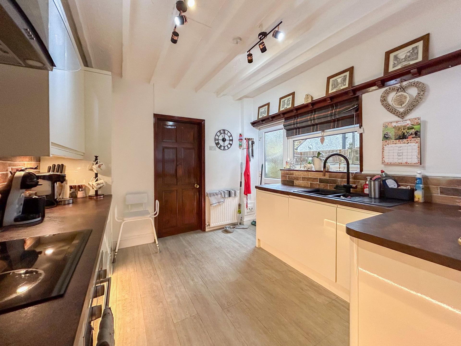 On the ground floor there is a bay-fronted living room to the front of the property, open plan to a rear dining space. Double doors open from here to the garden, with further access from the kitchen. The sleek white kitchen has a dark wooden worktop, with a brick effect backsplash and painted overhead beams adding wonderful character. There are several integrated appliances, including, a fridge/freezer, oven, four-ring electric hob, a dishwasher and LED under unit lighting. There is a useful utility space beyond and the bathroom, with a large bath suite and separate shower. The garden is tiered, with seating areas and rear access. On street parking is available to the fore.