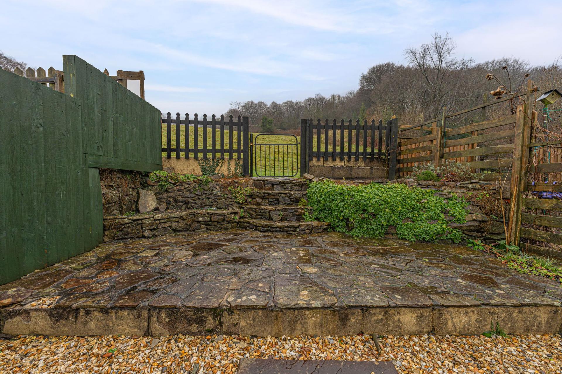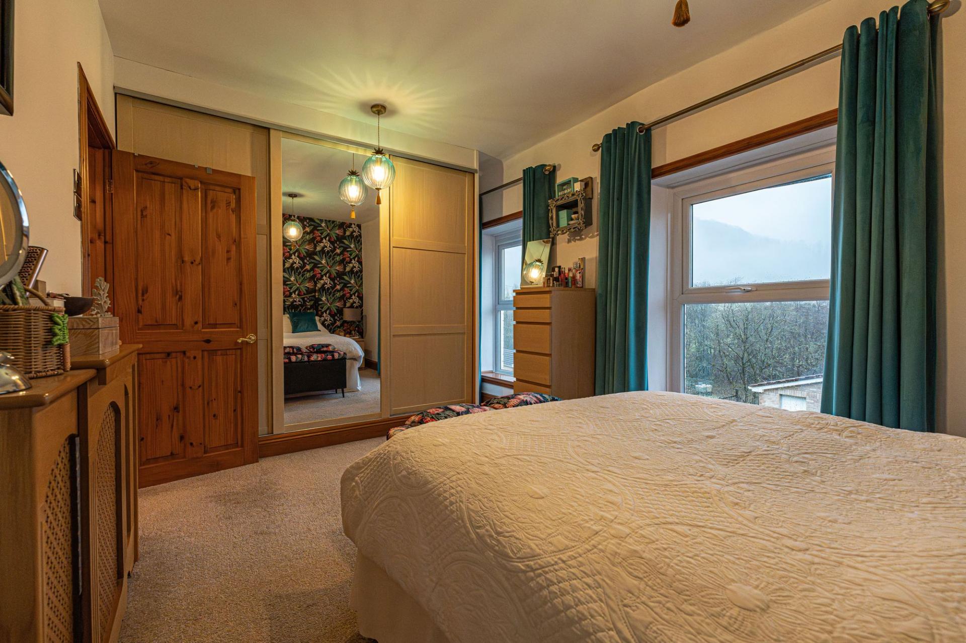 Both the kitchen and dining area features doorways to access the garden, where we there is a patio from the house that connects to a helpful storage shed and a fantastic utility room, great for storage and managing household tasks. The multi-tiered garden continues beyond, with a charming blend of lawn, patio and pebble stone, with ample space to relax and entertain. Another incredible feature of the property is the breath-taking views of the surrounding countryside.