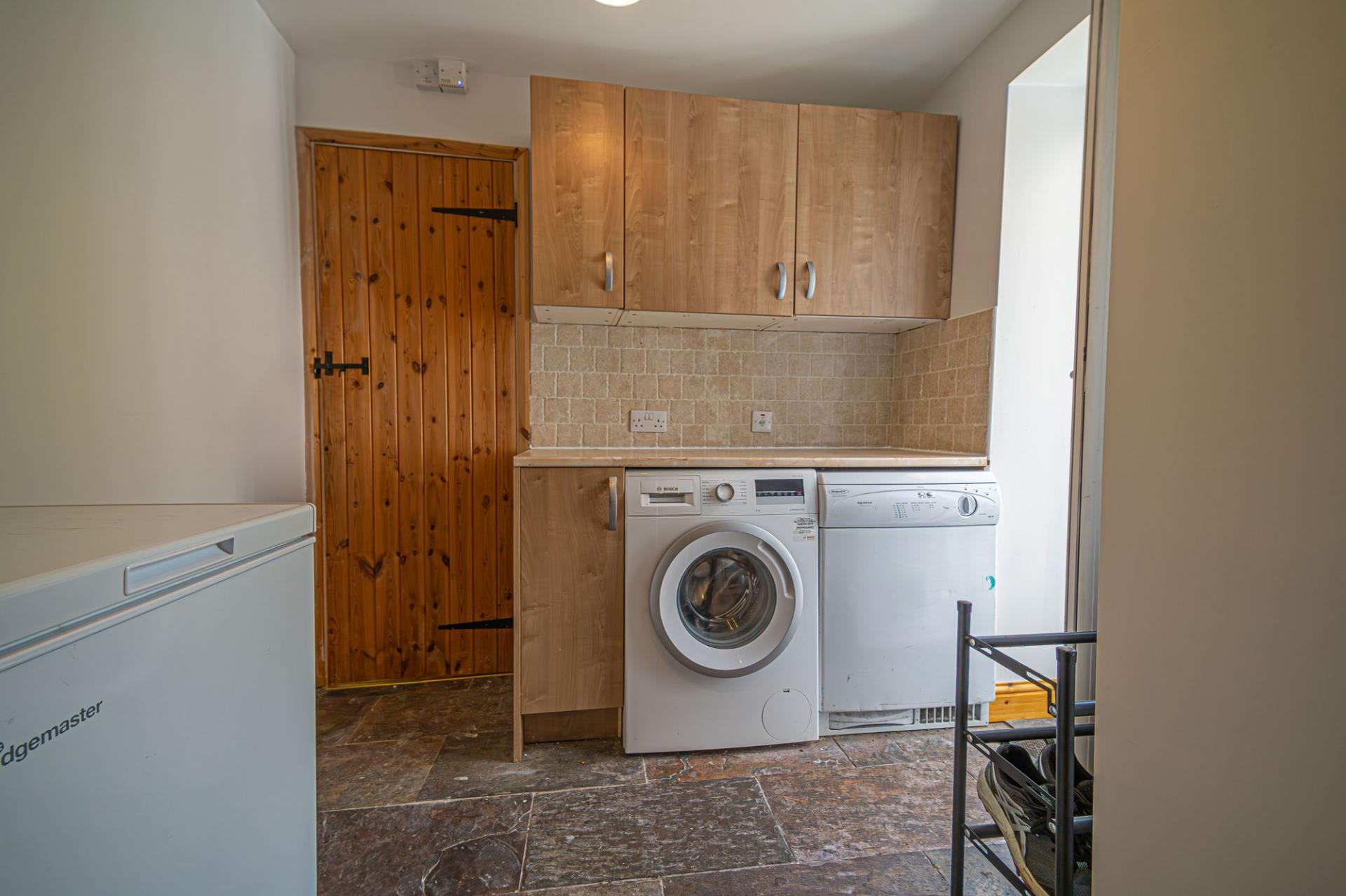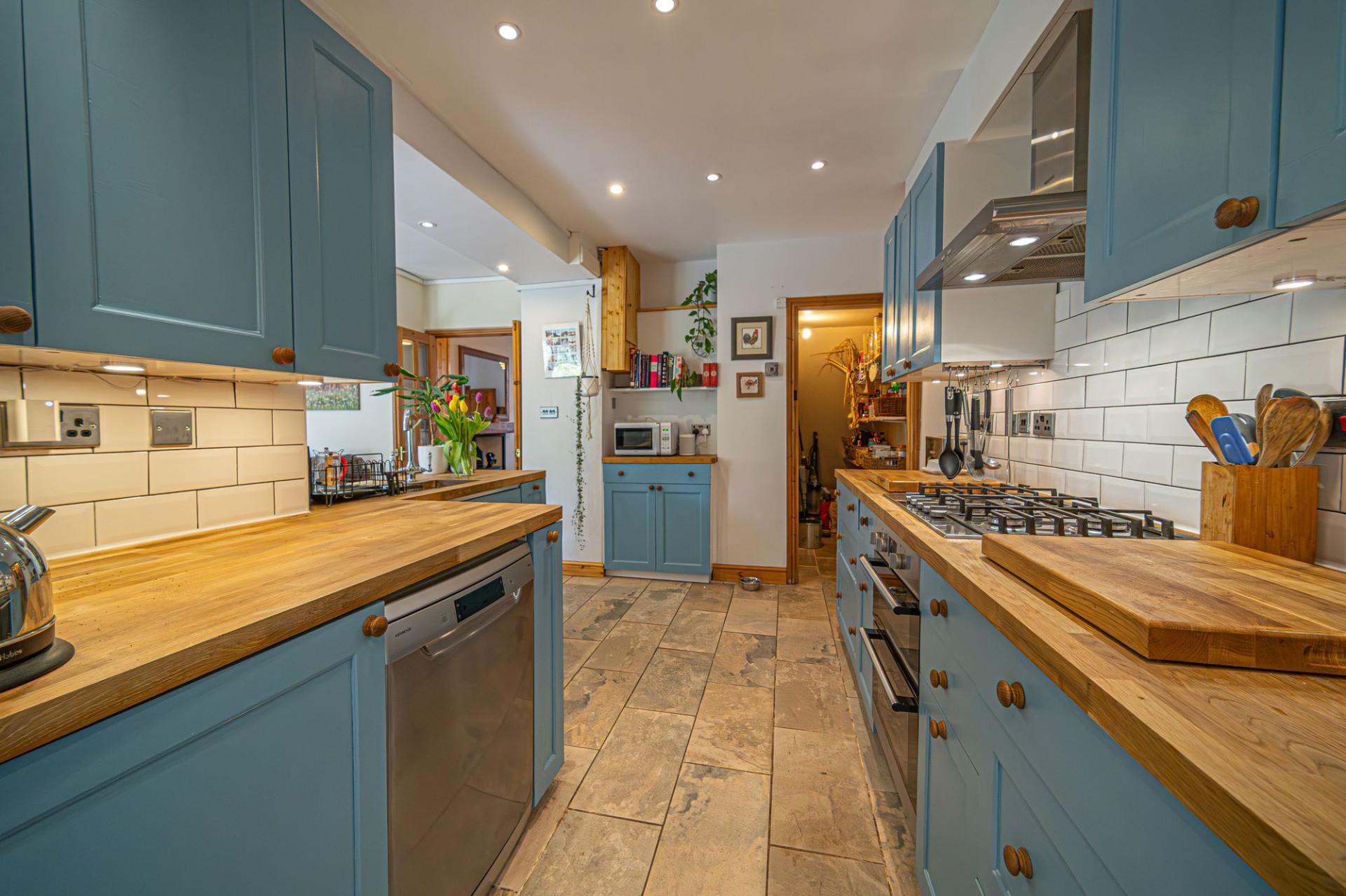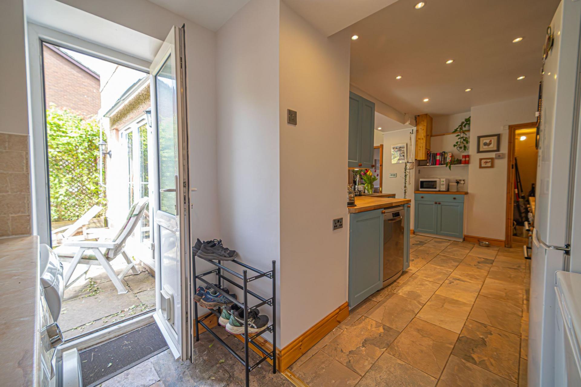 We enter this fabulous property to the front, where we are welcomed into the impressively sized reception room, which is perfectly suited to double us as both the living room and dining area, with a charming wood burner in the fireplace and several bookcases fitted into the wall. Continuing through the property we have another spacious reception room, which connects to the neighbouring kitchen, and is flooded by natural light from multiple windows, including double doors that effortlessly open to the garden. This reception room provides further versatility to the property, and can act as a secondary lounge space or alternative dining room, giving residents the flexibility to stage the property in multiple ways. The hardwood kitchen itself is marvellously presented, with plenty of room for appliances and ample storage through the various fittings, and an under stairs pantry cupboard. A utility section also provides access to the garden, as well as connecting to a useful shower room.