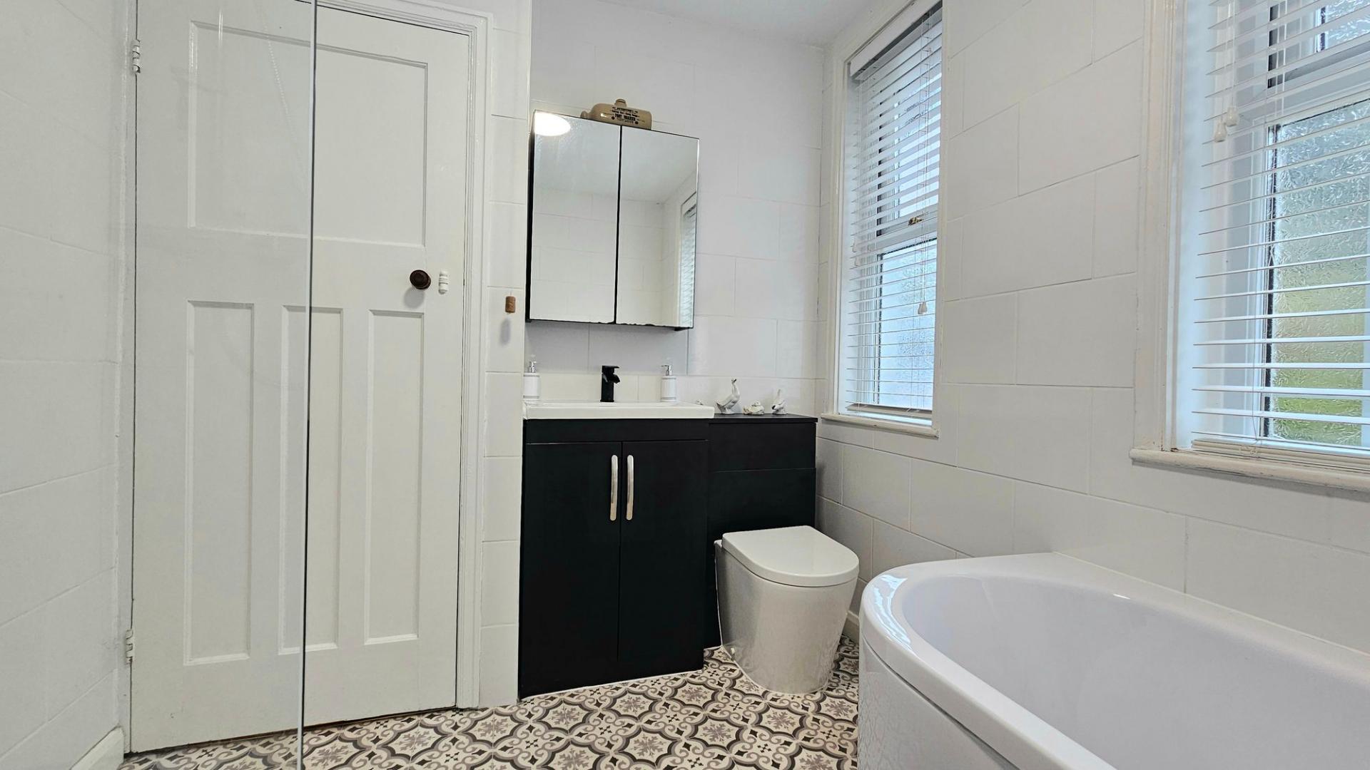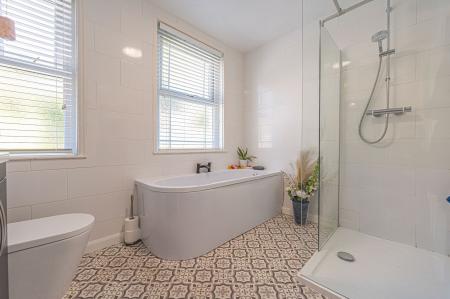 To the first floor we have three bedrooms, including two doubles and a third single, which is currently in use as a fantastic home office. The two front facing bedrooms benefit from a great view of the surrounding area, whilst the sleek family bathroom is shared from the hallway, equipped with a bath suite and a separate walk in shower unit.