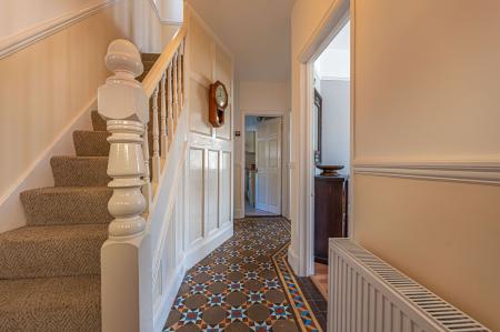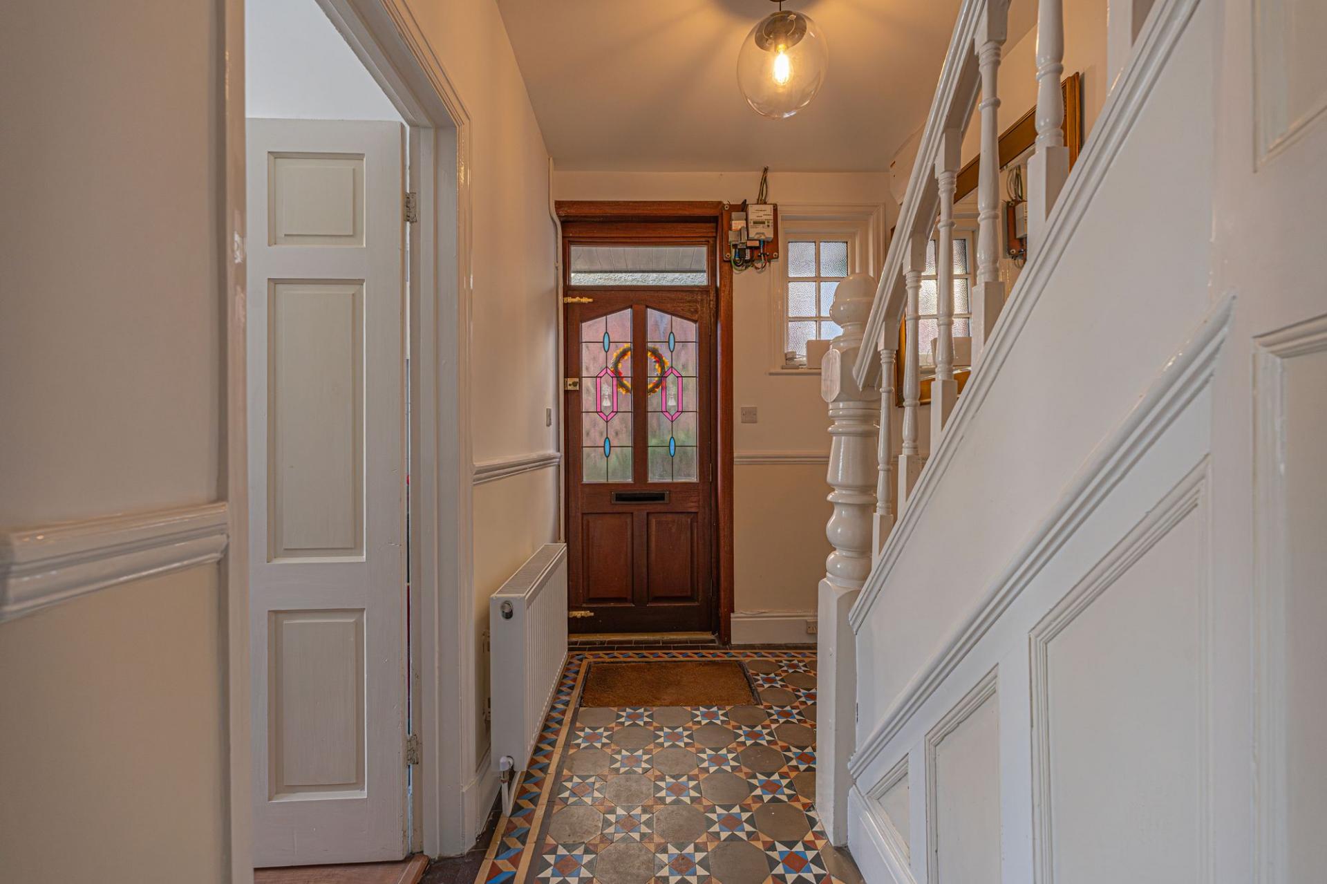 This charming three-bedroom semi-detached house offers an impressive blend of classic period features and modern updates, creating a welcoming and stylish family home. From the entry hallway we can find a gorgeous mosaic style tiling, while the two reception rooms have been newly redecorated with a wood-effect laminate flooring, and retain the original fireplaces for decorative effect. Both the lounge and dining room are spacious in size and flooded with natural light, thanks to the luxury of the bay windows. From the entry hallway we can find the practical kitchen, with various storage units surrounding the fitted hob and oven, while further storage can be found from a useful pantry cupboard underneath the staircase.