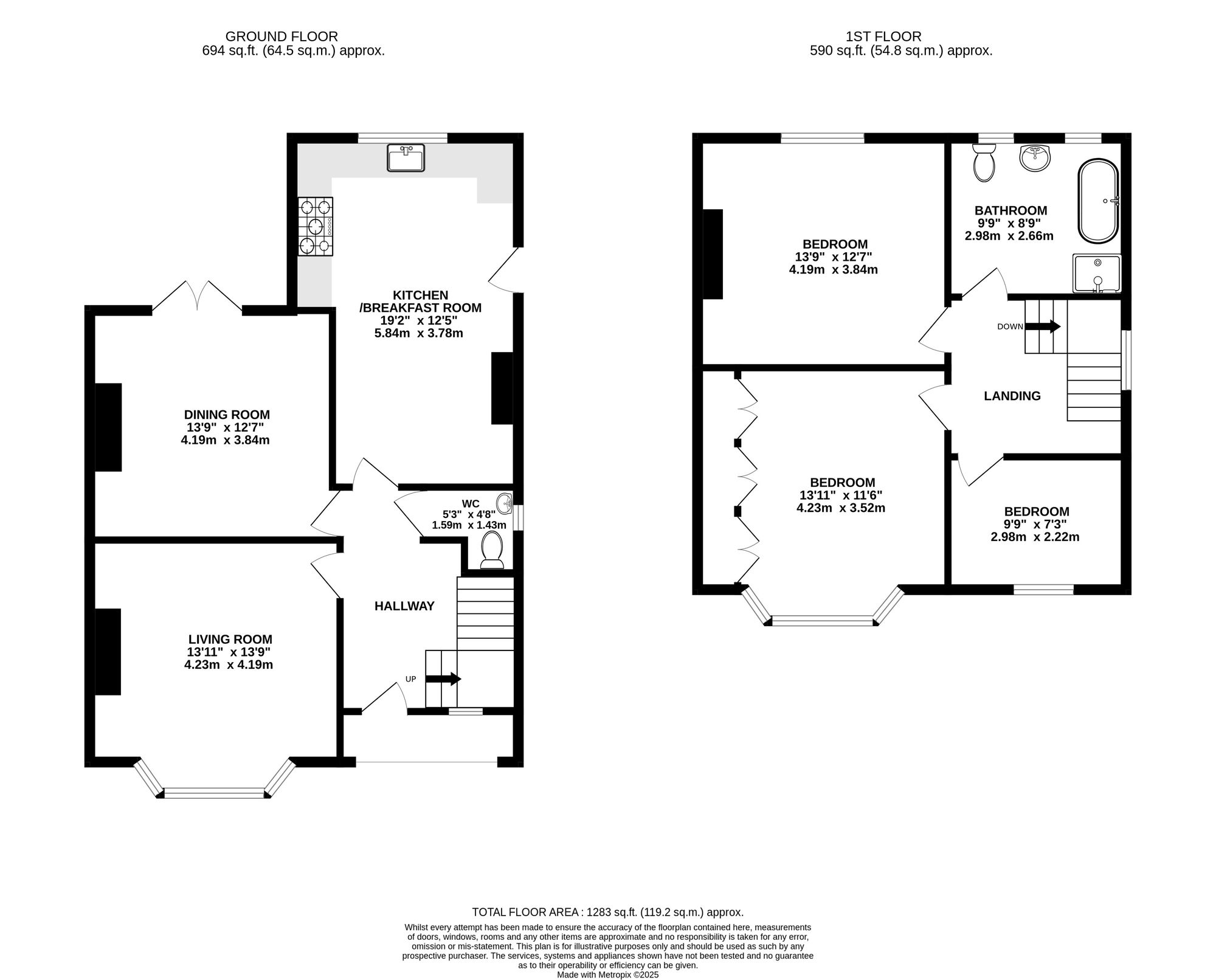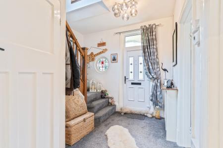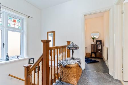 Internally, the home offers an abundance of space and character. The ground floor comprises two generous reception rooms: a bright and inviting living room with a feature bay-fronted window, and a dining room with patio doors that open directly to the rear garden—perfect for entertaining and indoor-outdoor living. The large kitchen/breakfast room is a standout feature, complete with ample storage, room for informal dining, and a charming feature fireplace that adds warmth and personality to the space. A cloakroom/WC is also conveniently located off the wide and welcoming hallway.