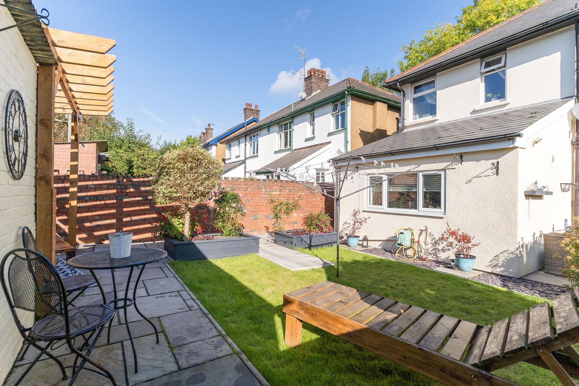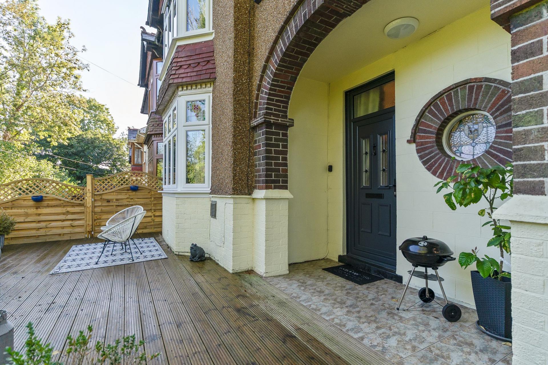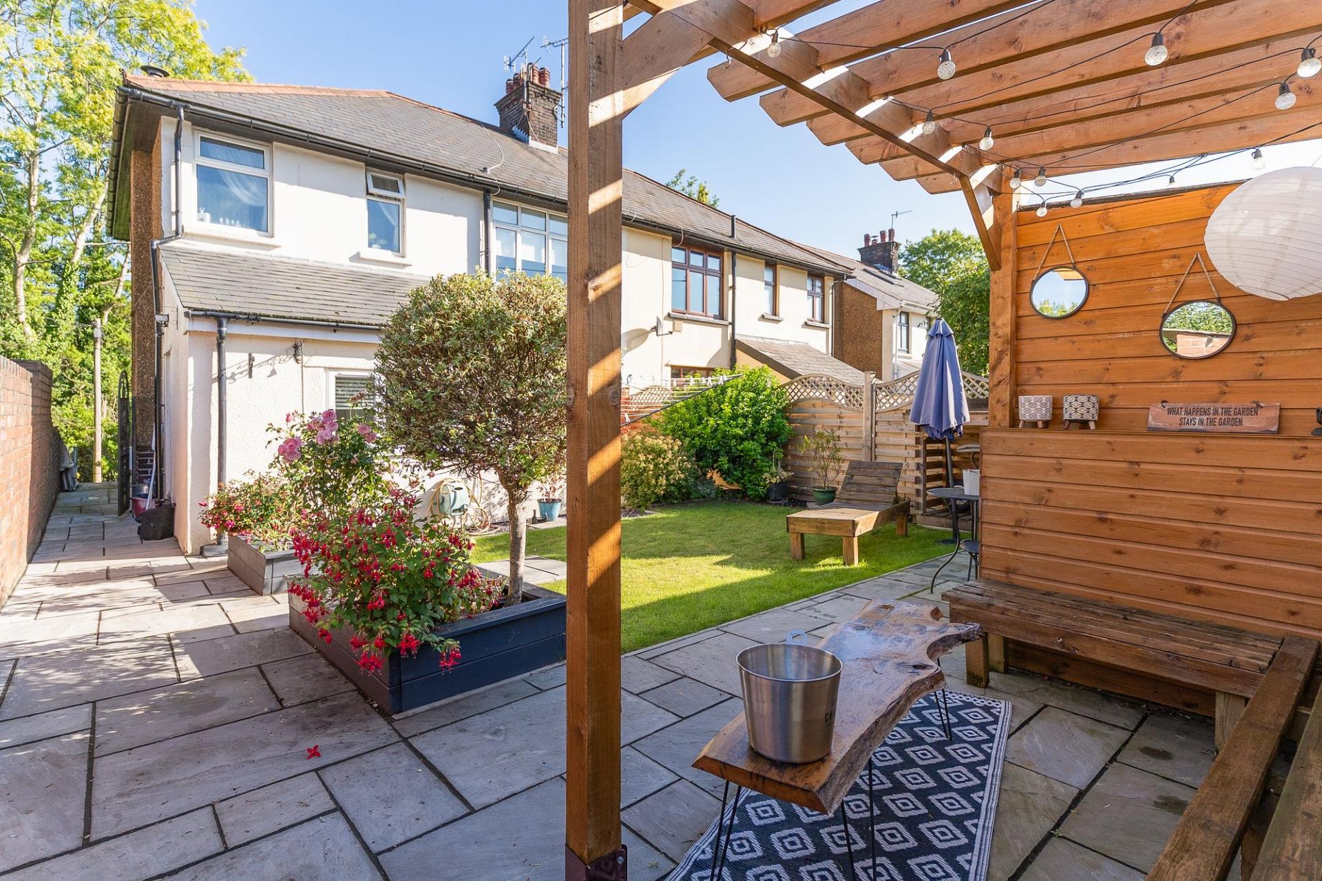 Approached via a quiet pedestrian walkway, the front of the property features a charming garden area, complete with a private raised decking—a perfect spot for outdoor seating or morning coffee. A side gate offers access through to the beautifully maintained rear garden, which is laid out with patio areas, a well-kept lawn, and raised planters—ideal for keen gardeners or family enjoyment. To the rear, you also benefit from road access and ample parking—a rare and valuable asset in this location.