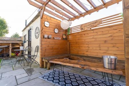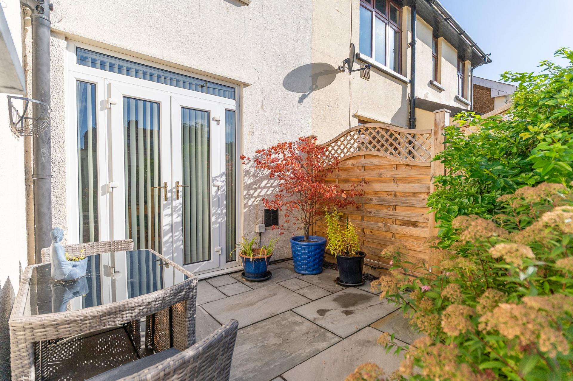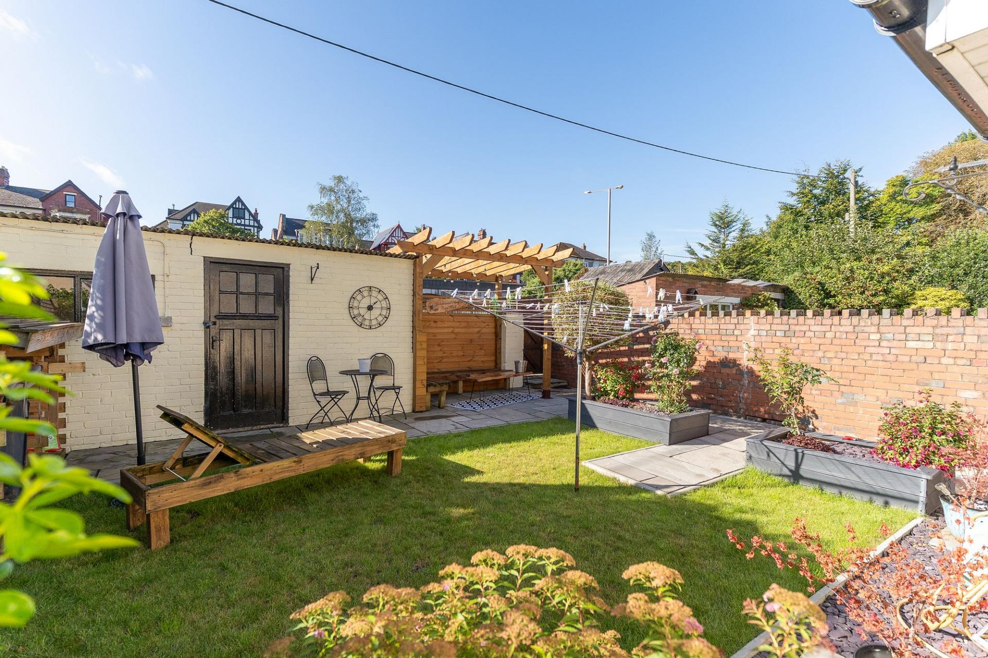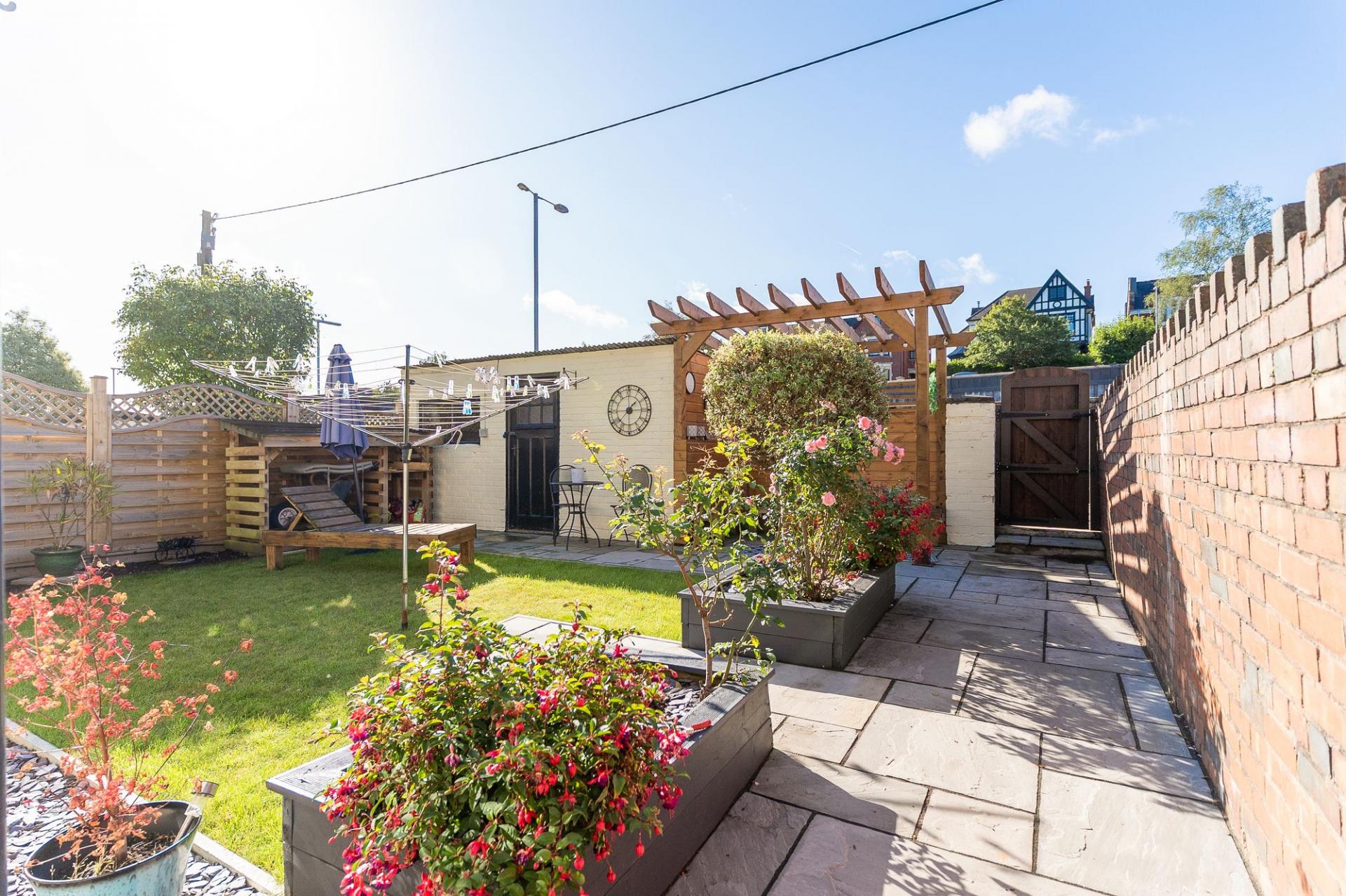 Approached via a quiet pedestrian walkway, the front of the property features a charming garden area, complete with a private raised decking—a perfect spot for outdoor seating or morning coffee. A side gate offers access through to the beautifully maintained rear garden, which is laid out with patio areas, a well-kept lawn, and raised planters—ideal for keen gardeners or family enjoyment. To the rear, you also benefit from road access and ample parking—a rare and valuable asset in this location.