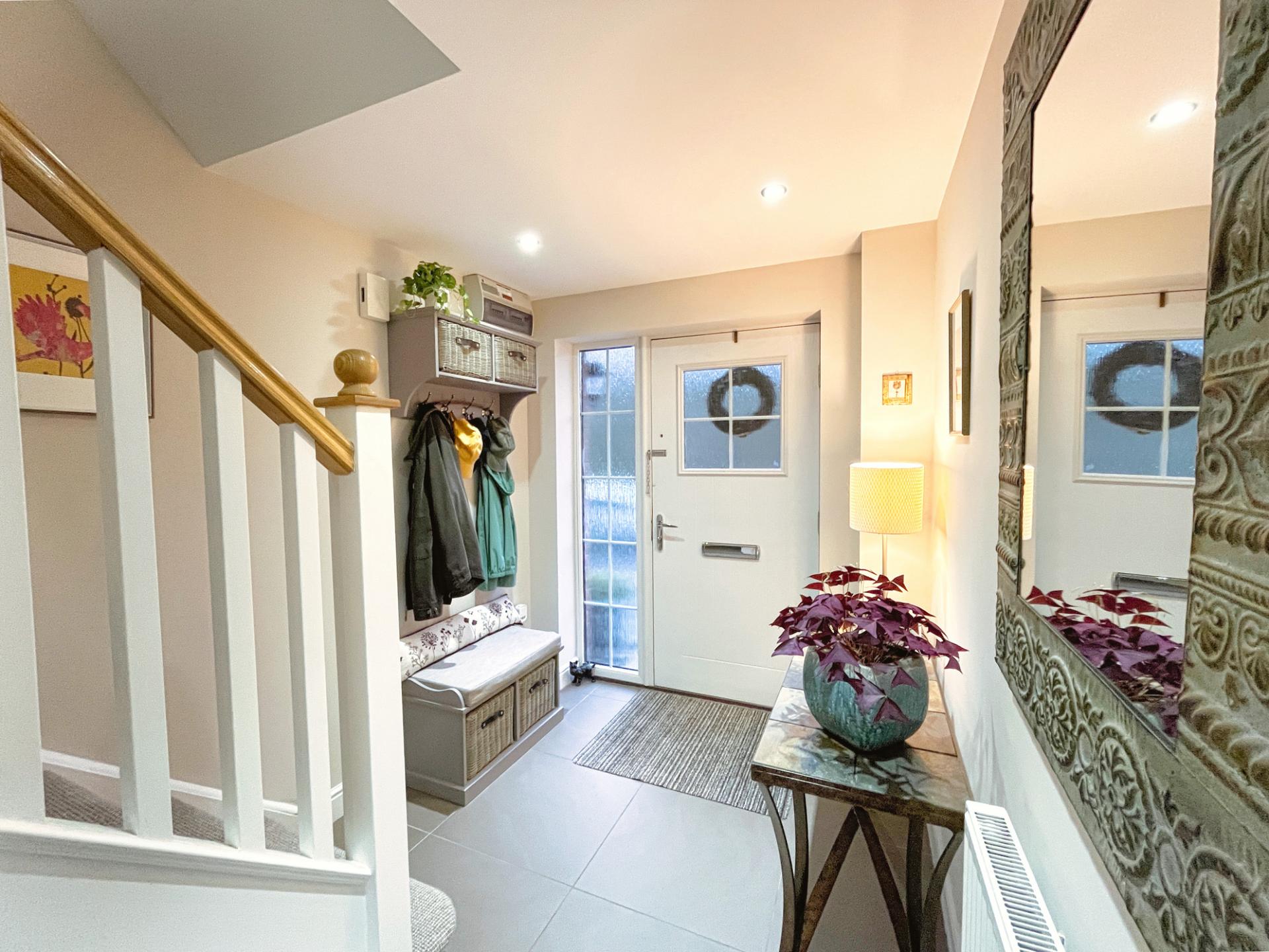 - Part glazed front door opens into a welcoming tiled hallway with carpeted stairs, WC and understairs storage.