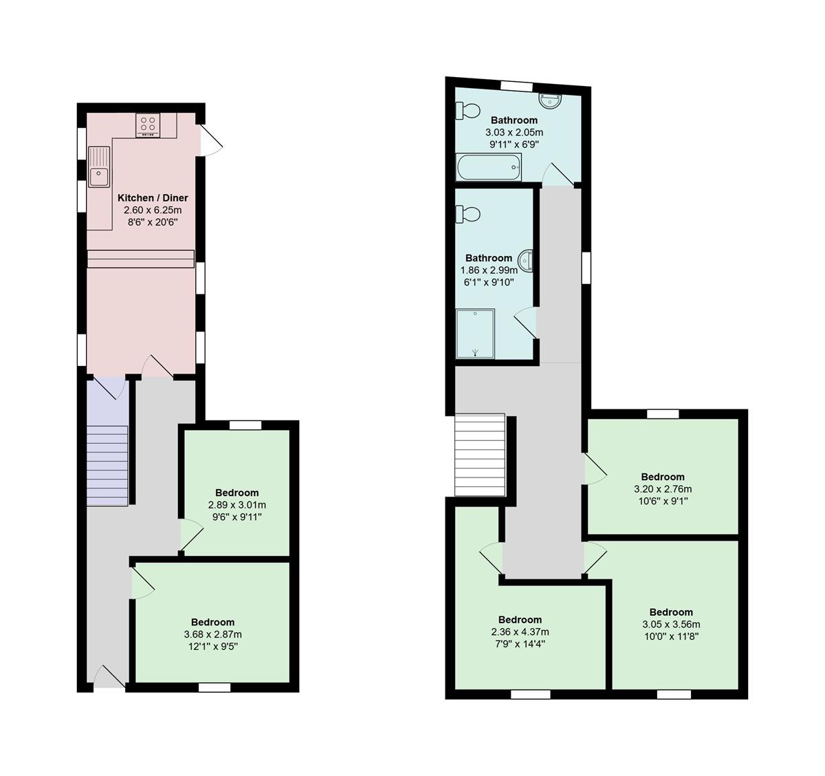 The ground floor features two well?proportioned bedrooms, both newly carpeted and freshly painted. A spacious fitted kitchen/diner sits at the rear of the property, offering ample room for communal living and providing direct access to the exterior.