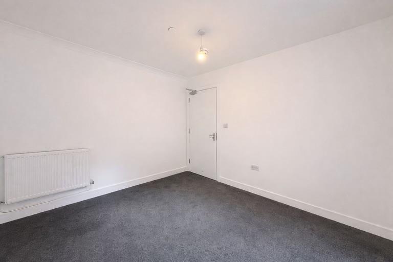 White door with silver handle upon entry, grey carpet, white skirting boards, white walls, one white radiator, two dual plug sockets, one window overlooking rear.