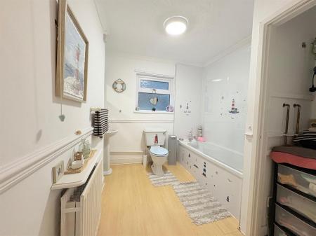 White door with gold handle upon entry, white skirting boards, light wooden laminate floorboard, white skirting boards, white walls, white tiling surrounding sink, white pvc panneling surrounding bath, white bath with silver taps,white sink with silver taps, white toilet, one frosted window overlooking rear, boiler is located here.