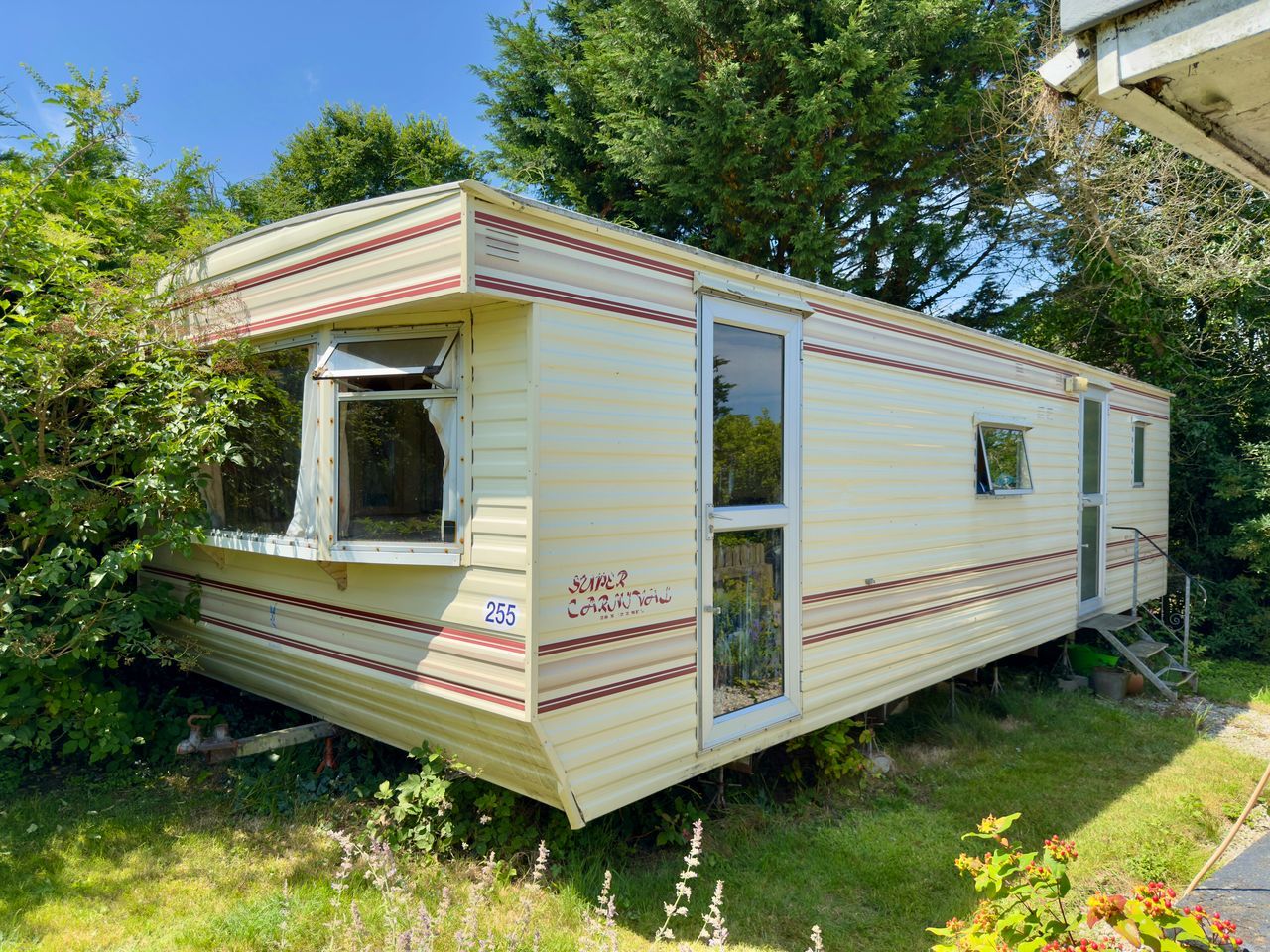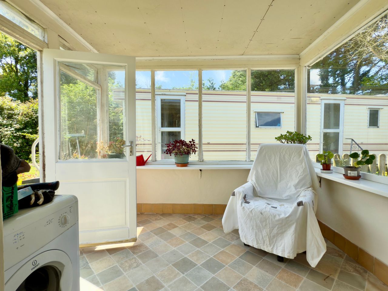 - Static caravan in garden