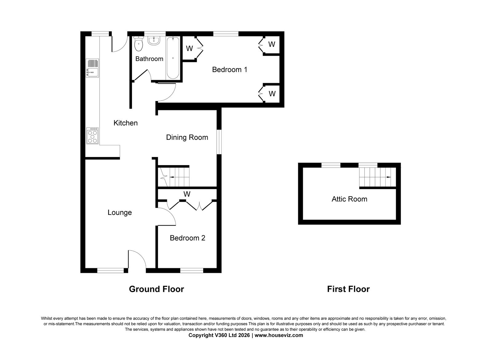 There is one bedroom to the front of the property and the main bedroom is at the rear with plenty of built in wardrobes. From the dining room there is a ladder type staircase to the attic room. Now that there has been a pressurized hot water system fitted the water tank in the remaining loft has been removed so it appears there would be room to now install a proper staircase should a purchaser want to create a third bedroom upstairs.