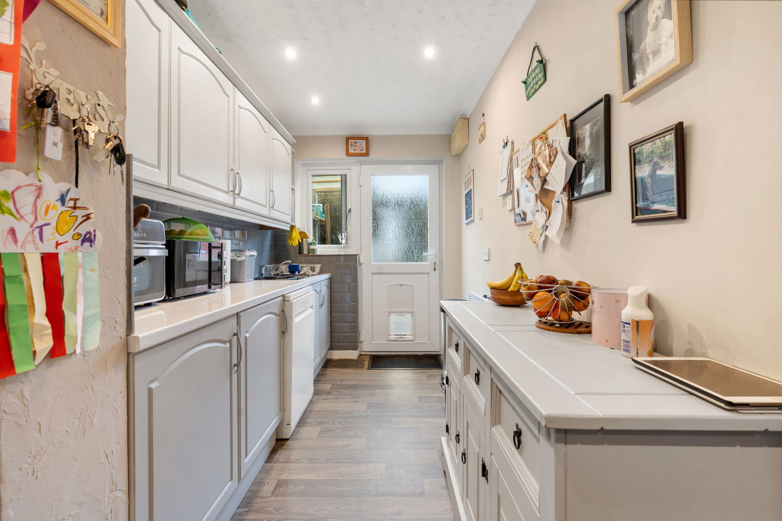 The bathroom is at the rear of the property and has an electric shower over the bath, wc, handbasin and electric towel rail. The kitchen comes with a fridge freezer and dishwasher, there is space for a range cooker.