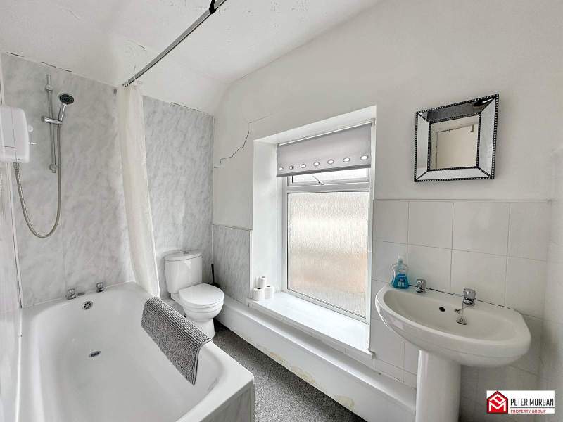 Comprising of a low level WC, wash hand basin and bath with electric shower. uPVC Frosted window to rear aspect, part tiled walls, radiator, carpeted flooring and access to loft above.