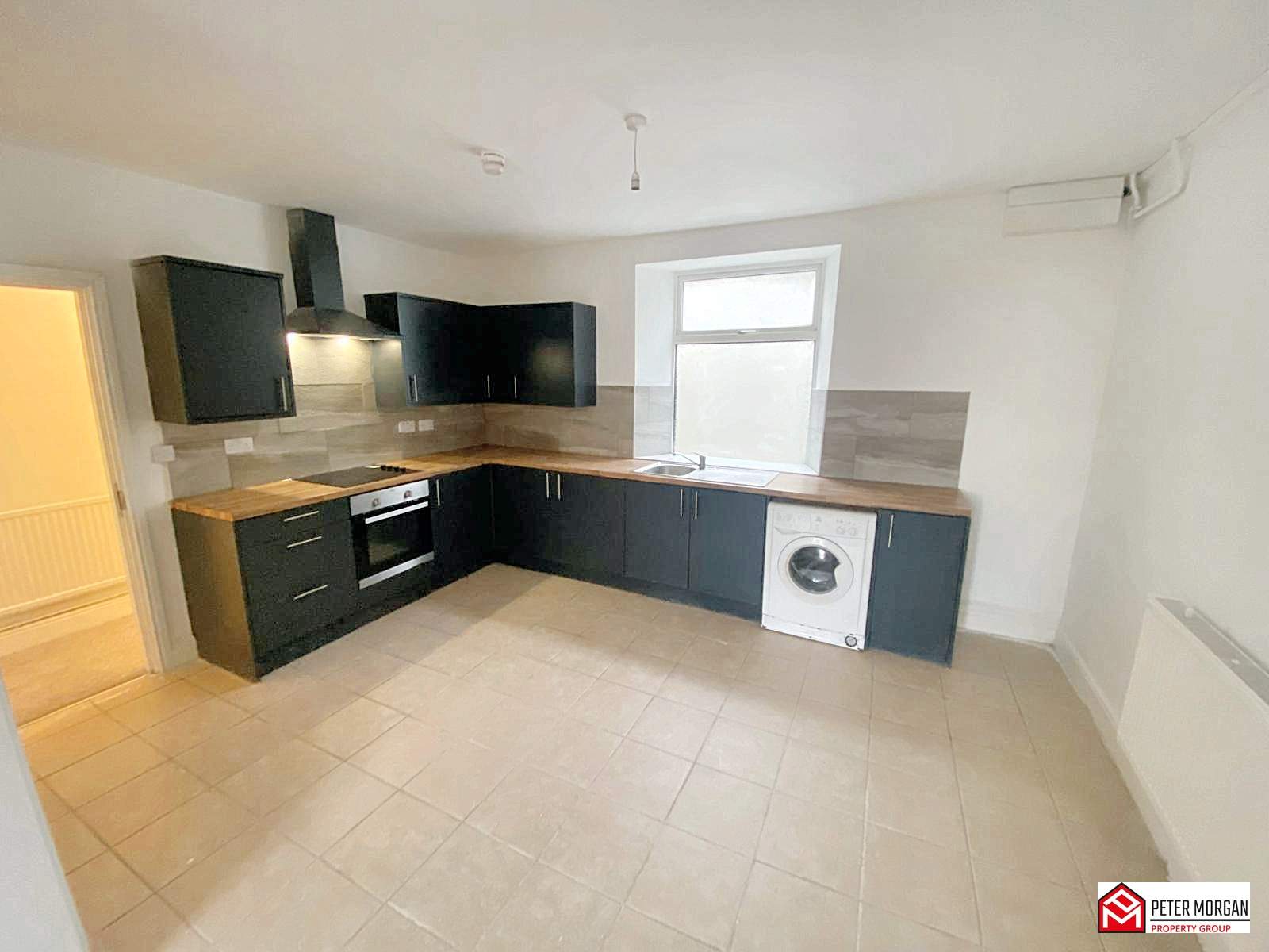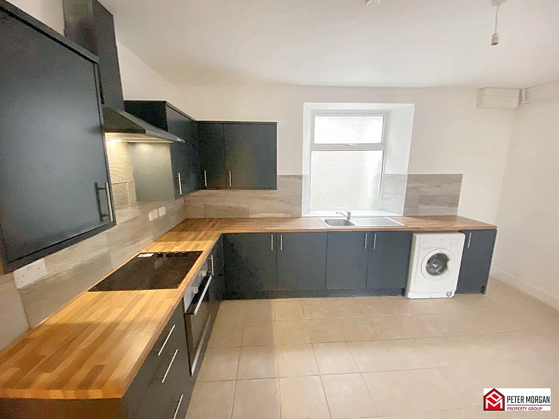 Appointed with a range of matching wall and base units with work tops over and inset stainless steel sink with mixer tap. uPVC double glazed window, built in hob with fan over, plumbing in place for washing machine, ceramic tile flooring, space for fridge.