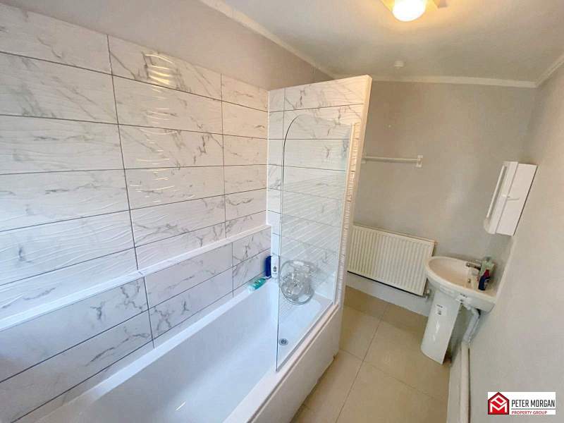 Newly fitted bathroom comprising of a low level WC, pedestal wash hand basin and shower cubicle. uPVC double glazed window, tiled flooring and radiator.