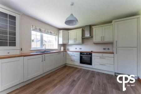Solid wood Kitchen with generous High and Low-level units,including integrated appliances Wood effect tiled Flooring, Patio PVC doors to paved patio area and lawn.
