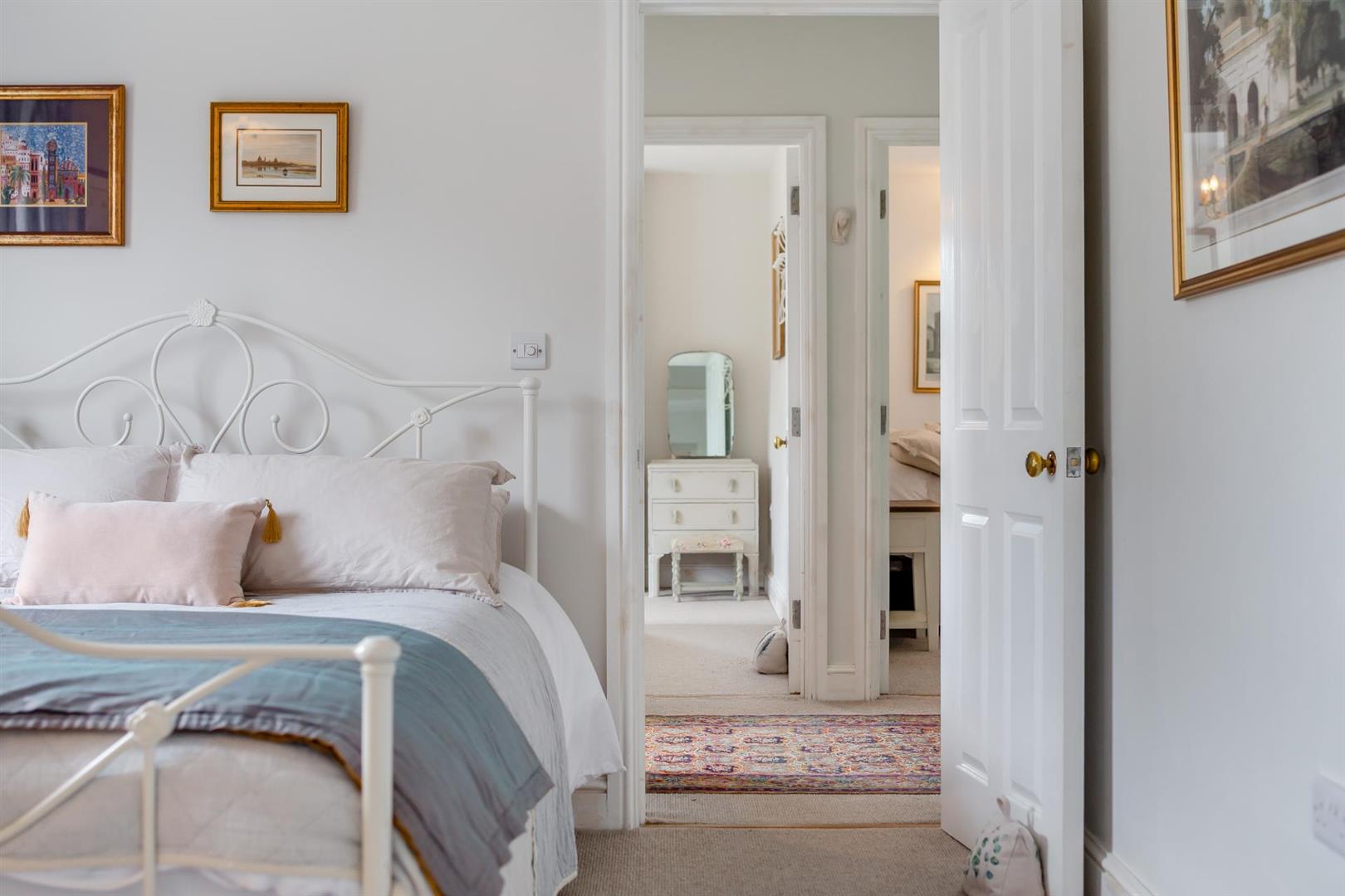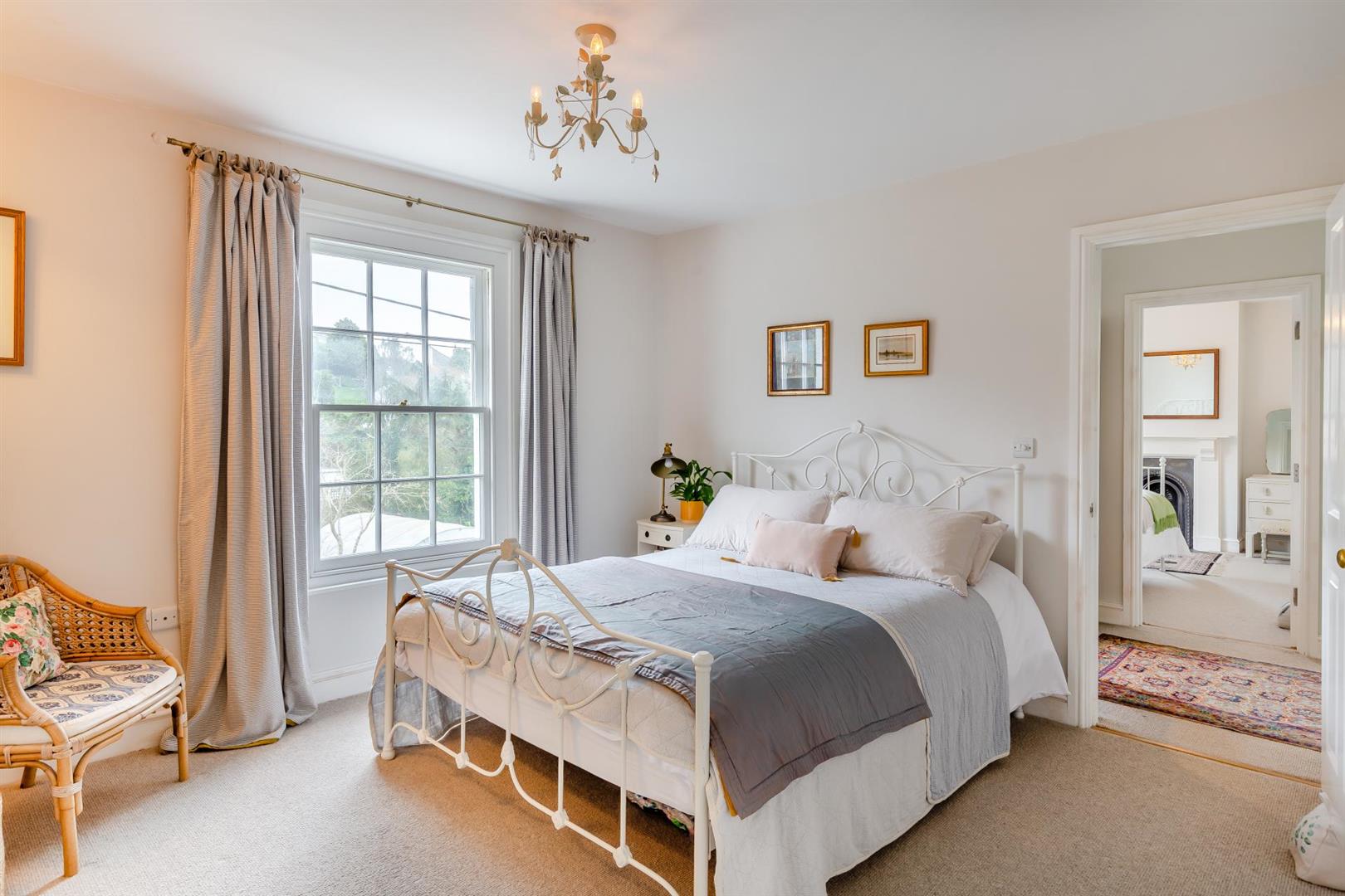 Master Bedroom Suite - Comfortable double bedroom with a decorative fireplace with a white mantle, slate hearth and cast-iron surround, a sash window to the front with an outlook over the front garden and sea glimpses in the distance. Sliding door to dressing room and door to.