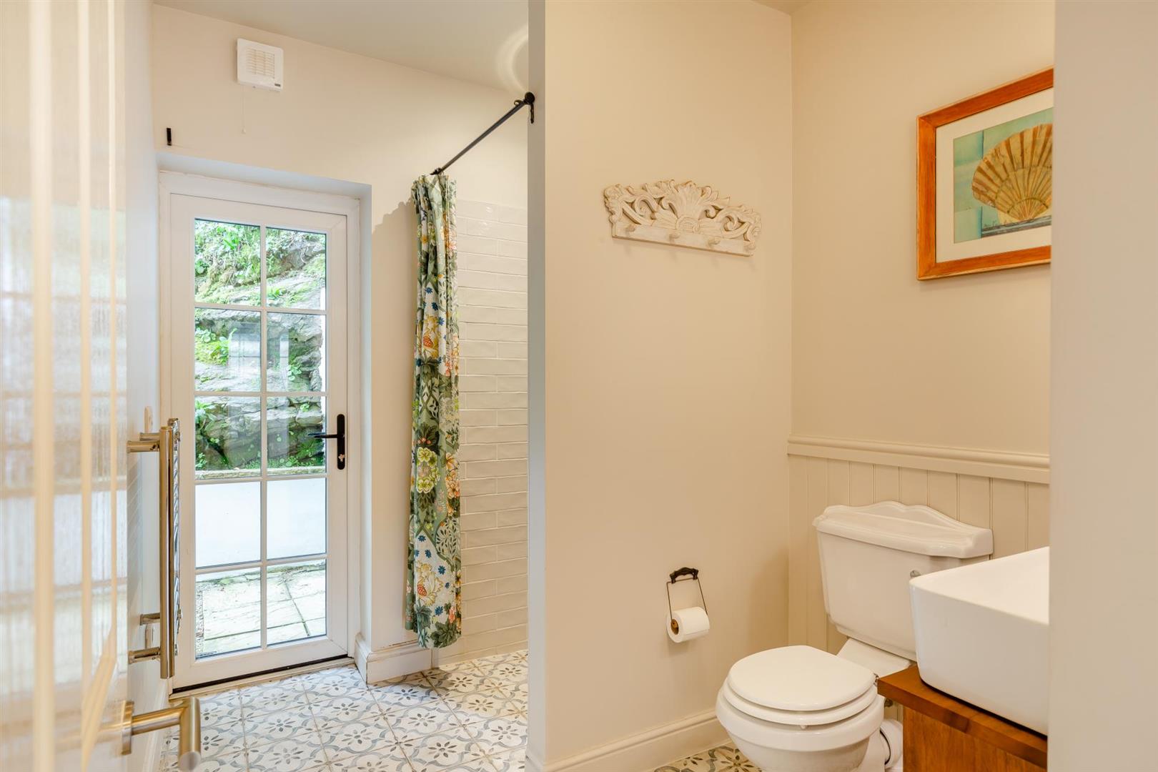 Beyond is a nicely tiled, walk in, shower with rain drencher head and shower attachment, a chrome heated towel rail, recessed spotlight, extractor and a door to the rear courtyard.