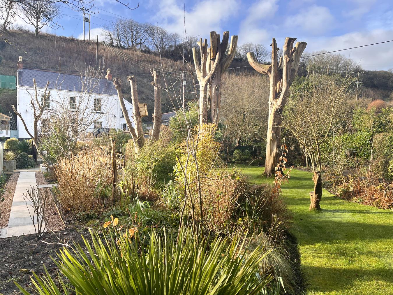 Enjoying a sunny outlook and reasonable degrees of privacy the gardens play host to an array of established specimen plants trees and shrubs and are neatly enclosed by local stone walling and mature hedging.