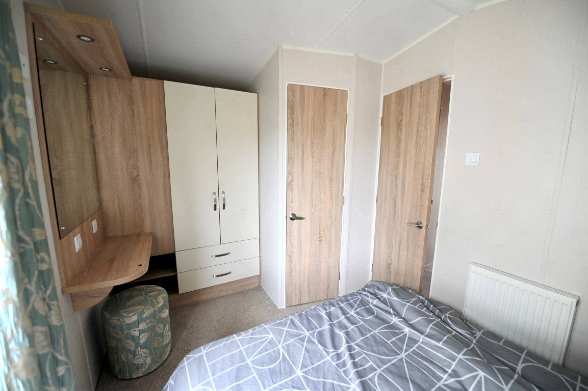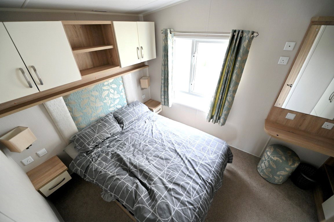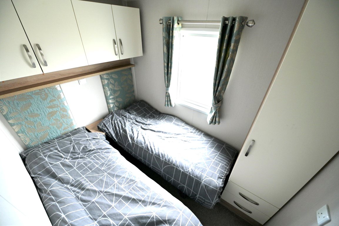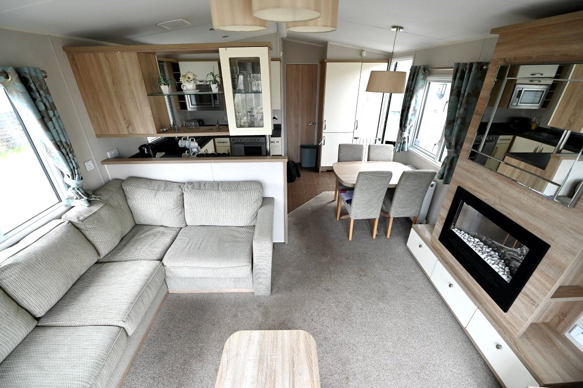 This well presented two bed static caravan enters into a spacious open plan living/ dining area with a fantastic full-length window allowing natural lighting throughout. The living area includes a corner style sofa bed, feature fireplace, dining area and good sized kitchen. The kitchen benefits from a range of storage units, oven and microwave. Excellent storage is featured throughout the accommodation with further full-length units beside the door. The master bedroom has a double bedroom with dressing unit, built in wardrobe and en-suite WC. The second bedroom features two single beds with a full-length built-in wardrobe and above bed storage. The main bathroom has a shower unit, WC and wash hand basin.
