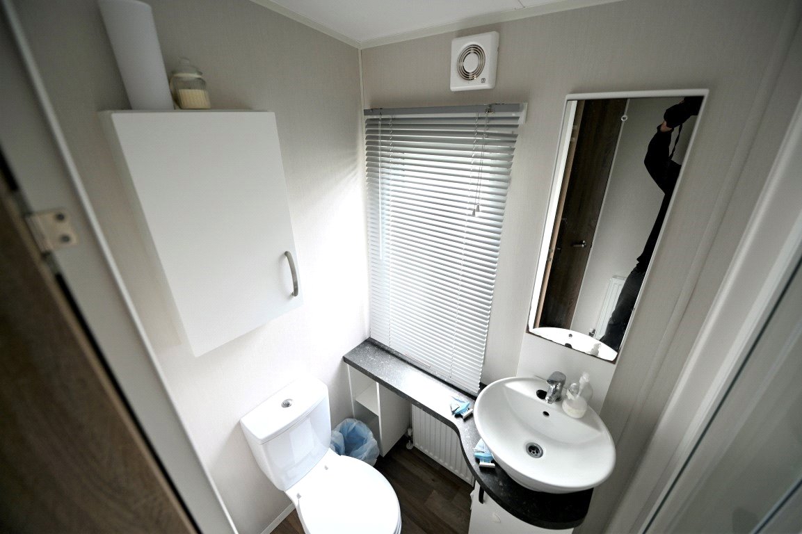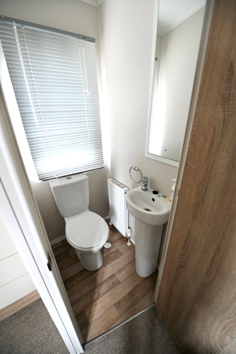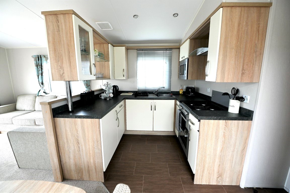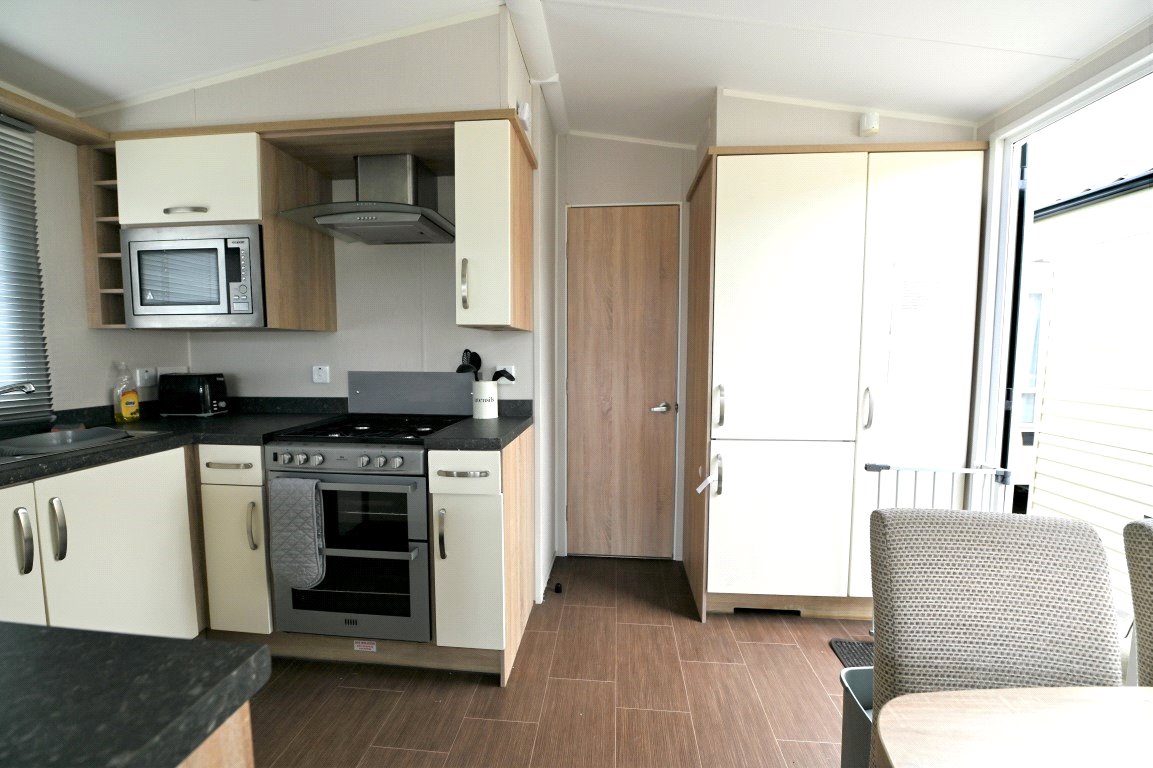 This well presented two bed static caravan enters into a spacious open plan living/ dining area with a fantastic full-length window allowing natural lighting throughout. The living area includes a corner style sofa bed, feature fireplace, dining area and good sized kitchen. The kitchen benefits from a range of storage units, oven and microwave. Excellent storage is featured throughout the accommodation with further full-length units beside the door. The master bedroom has a double bedroom with dressing unit, built in wardrobe and en-suite WC. The second bedroom features two single beds with a full-length built-in wardrobe and above bed storage. The main bathroom has a shower unit, WC and wash hand basin.