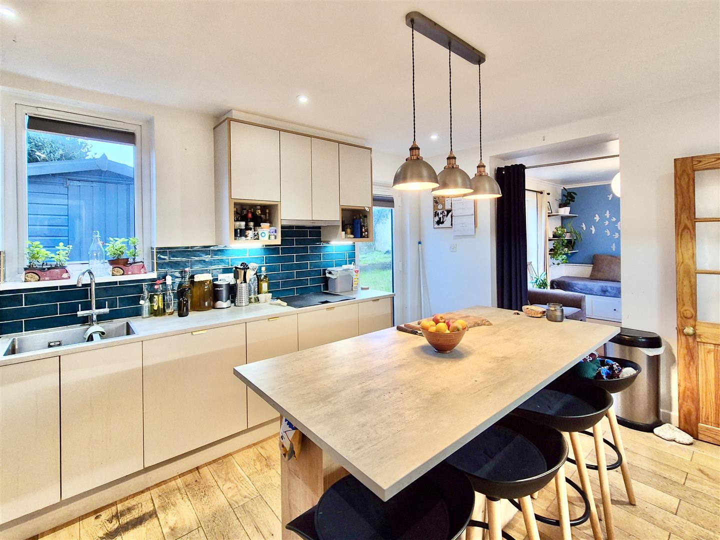 Kitchen - 3.81m x 3.73m (12'6" x 12'3") - An attractive kitchen comprising working top surfaces incorporating a one and a half bowl sink unit with drainer, cupboards and drawers under and wall cupboards over. There is a built-in hob with a hood over, built-in oven and space for a fridge freezer. Cupboard which has space for a washing machine and tumble dryer. The room has an outlook and door to the rear garden and a central island with cupboards under, pendant lighting over. Opening to the dining room and door to